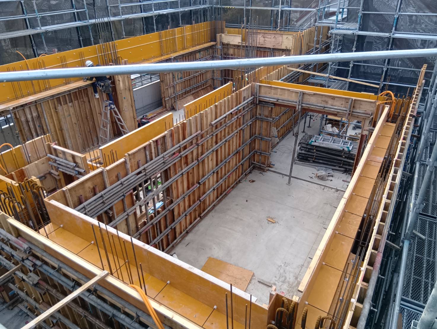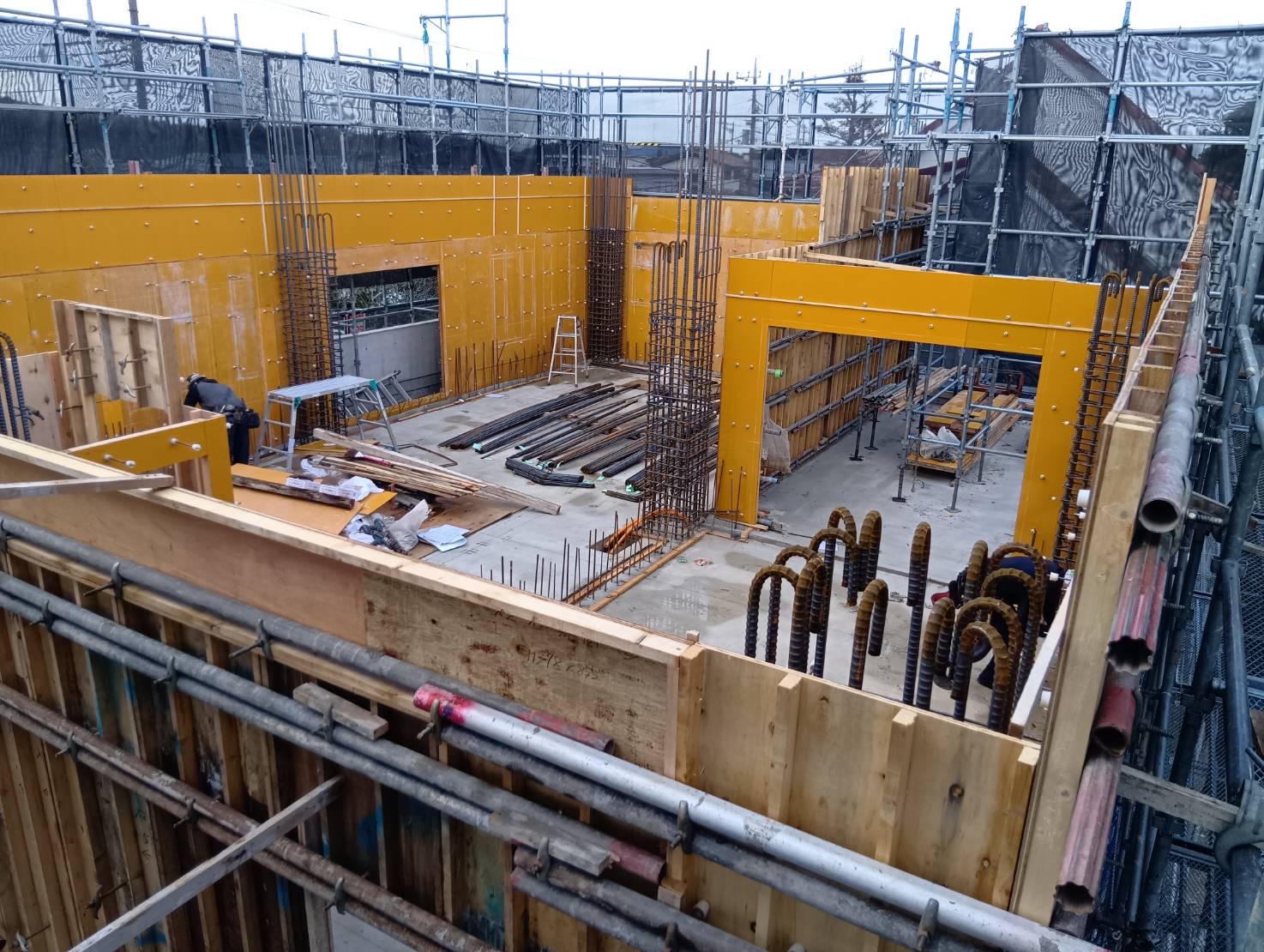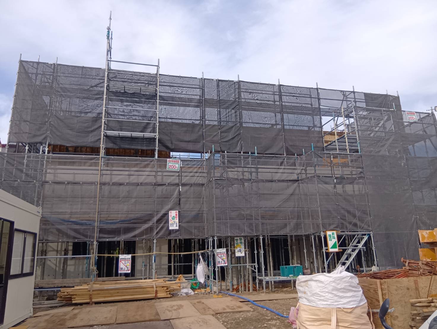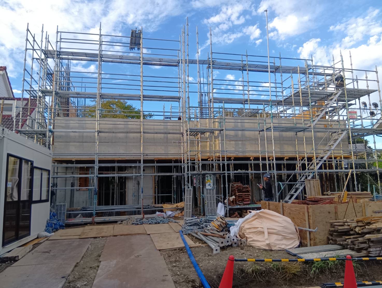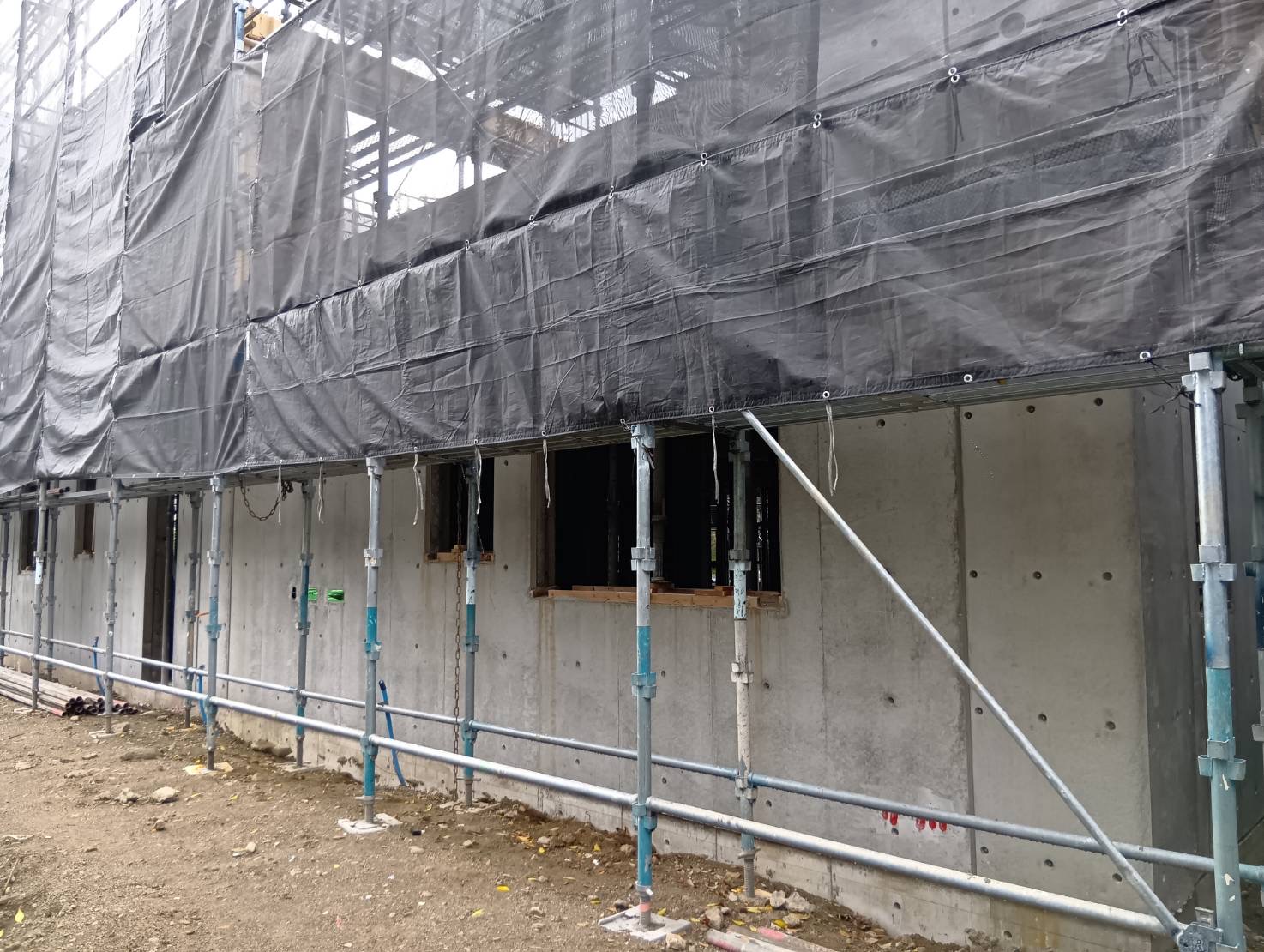 足場の組み立てが終わり、2階外壁部分の型枠が設置完了、