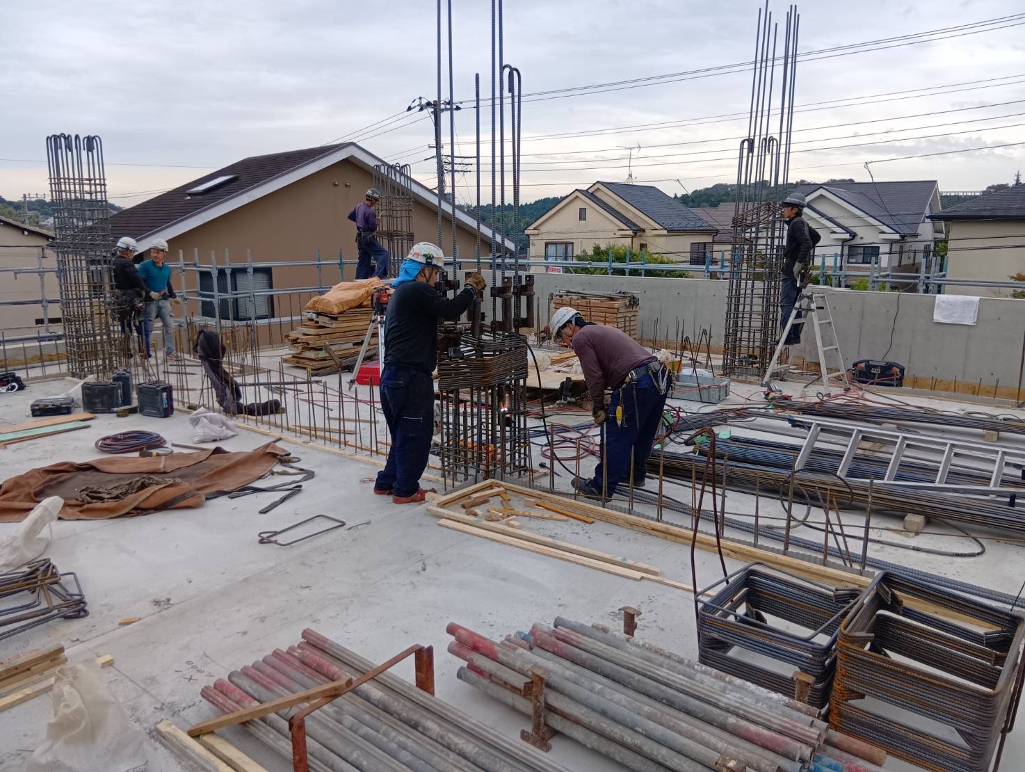 コンクリートの養生期間を終え、2階柱の配筋作業に取り掛かりました。