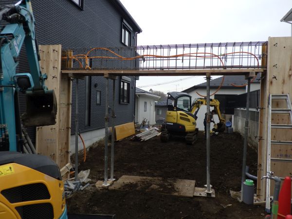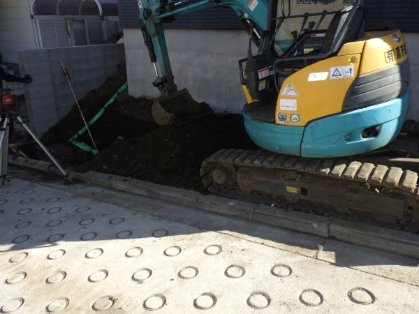 まずは、前面道路の傾斜に合わせて、建物前面の根伐りを行っています。