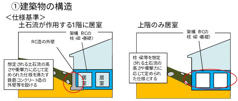 1.建築物の構造自体を、想定される土石流の高さや衝撃力に応じて定められた仕様を満たす鉄筋コンクリート造等で造ること。