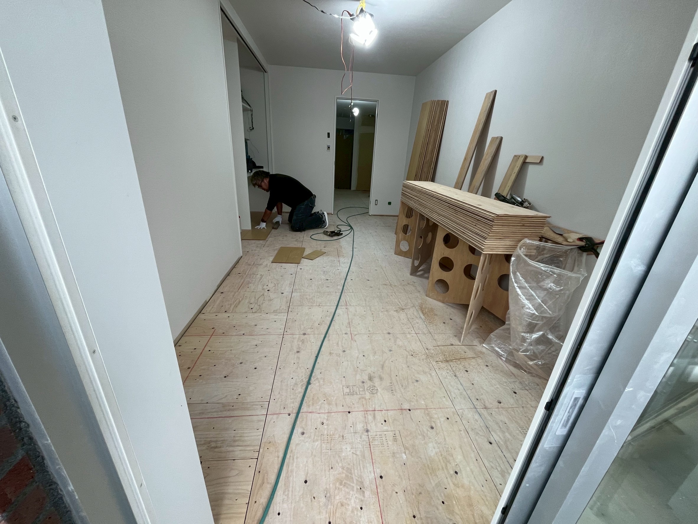際根太の上に構造用合板を載せ、床の構造が仕上がっています。
