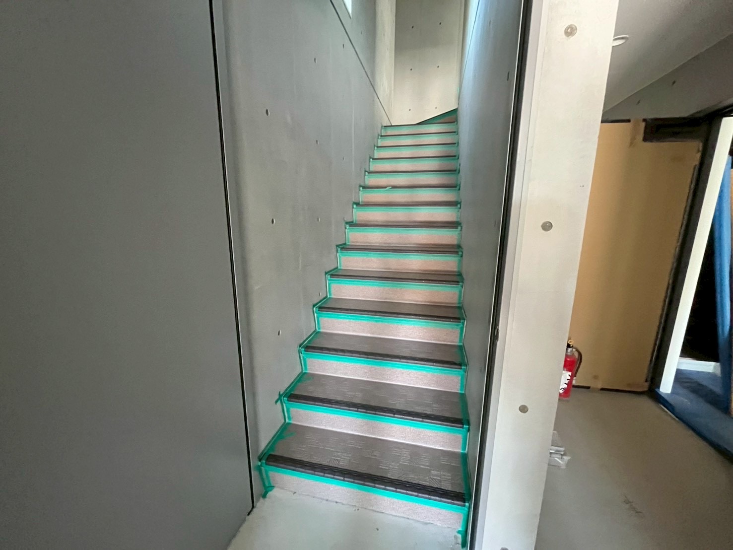 前回ご紹介した長尺シートは階段にも貼って、コンクリートとのすき間をコーキングで埋めていきます。