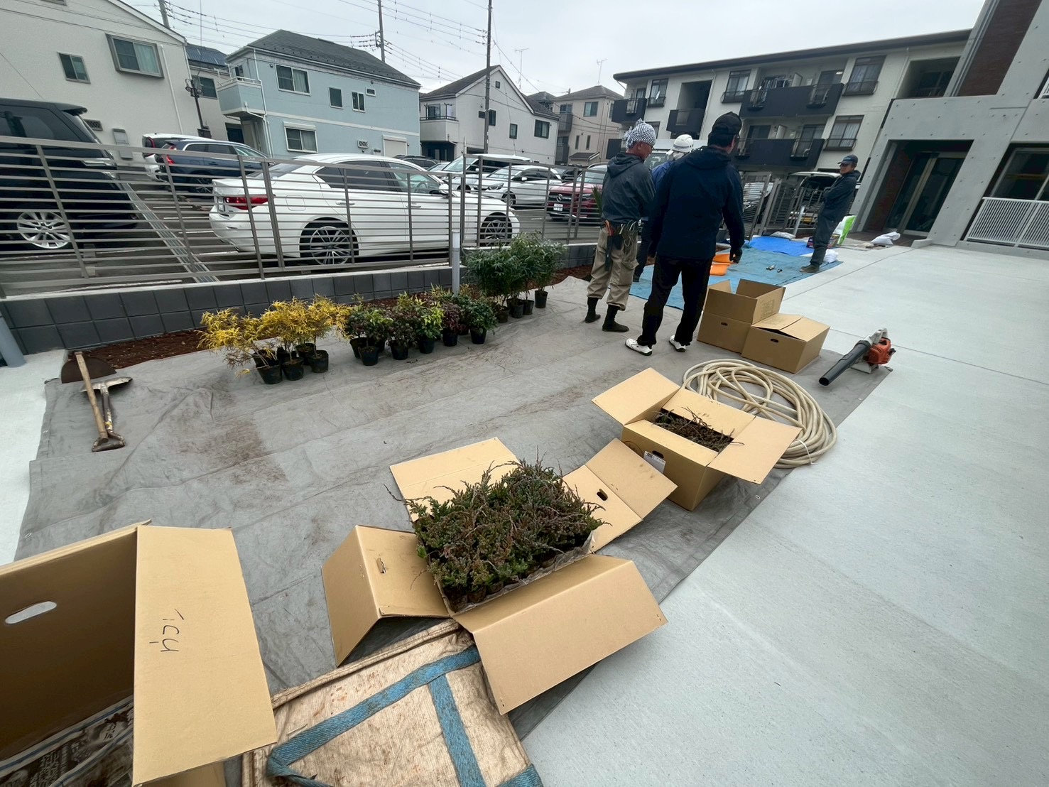 最後の仕上げに、左手の花壇に植栽を植えていきます。