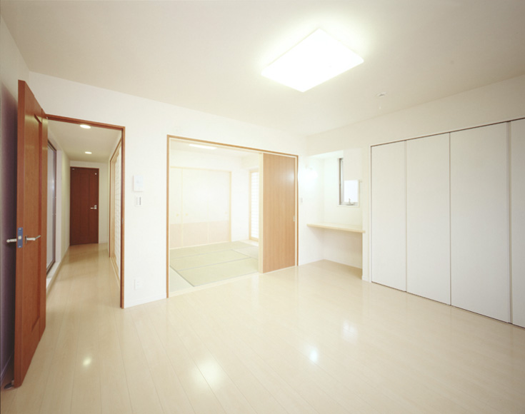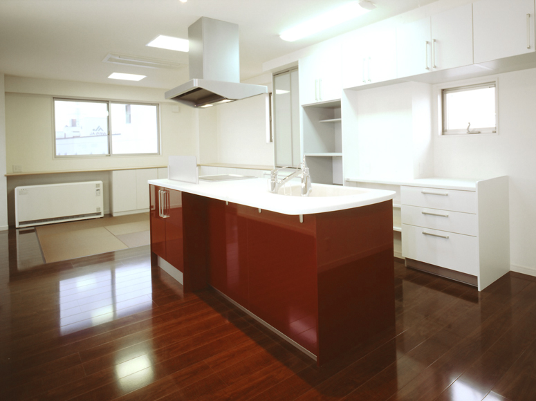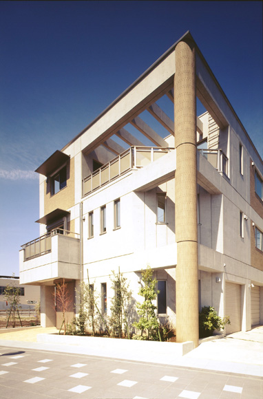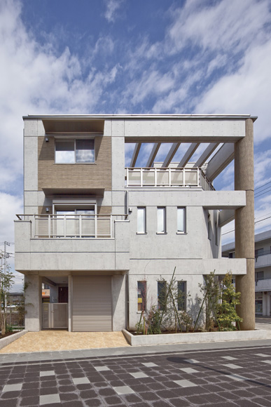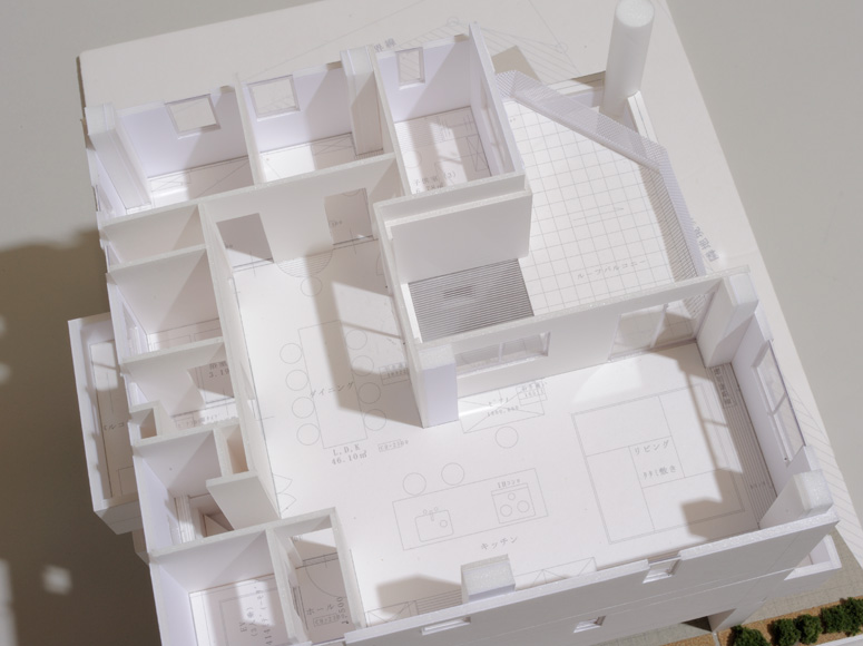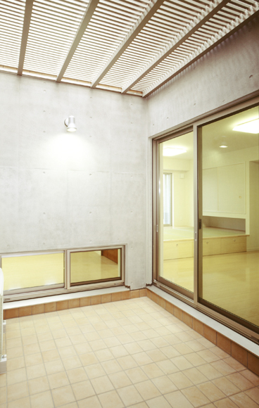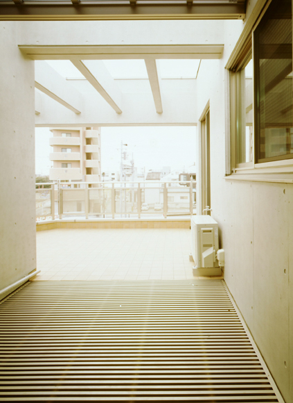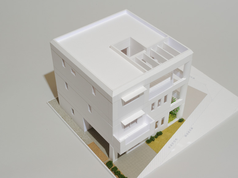 一辺が10mを超える立方体に近いRC住宅です。 この形状は北側の採光がとりにくく、風が通りにくいのがネックです。そこで3階にルーバーを設け、センターコア(建物中央を抜く方法)にして、2階に中庭を創りました。その頭上3階には、グレーチングと呼ばれるアルミ格子をかけ、バルコニーとして活用しながら光も風も通るようにしました。