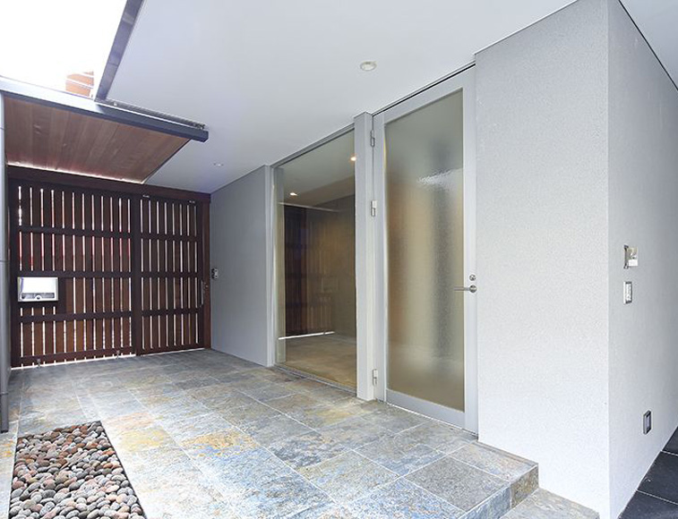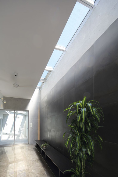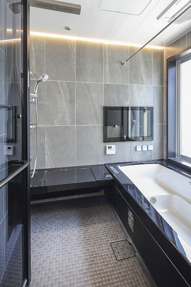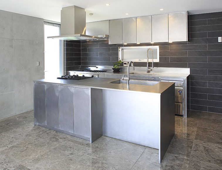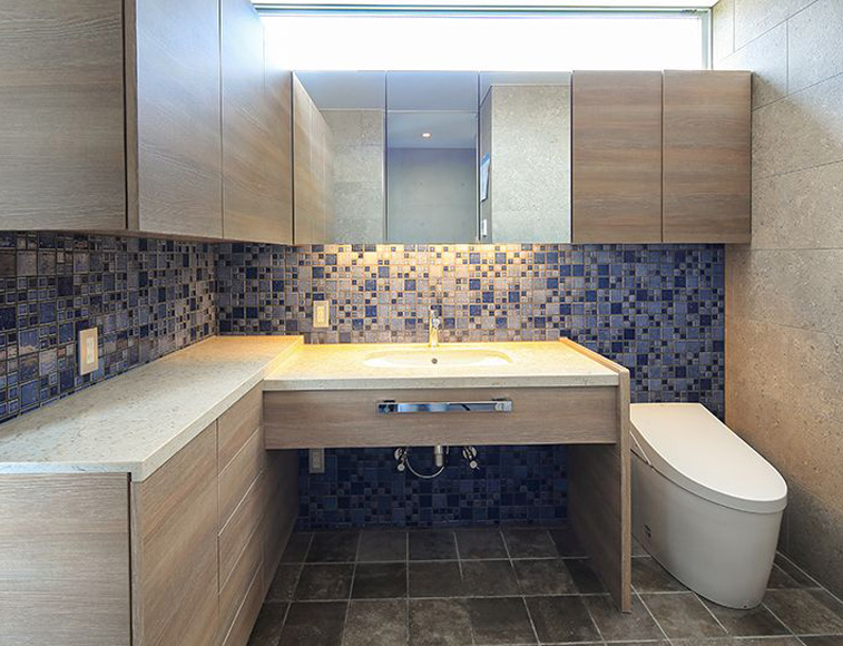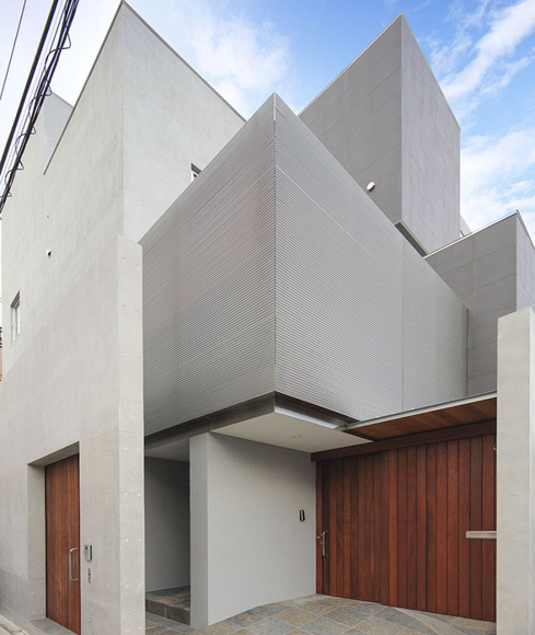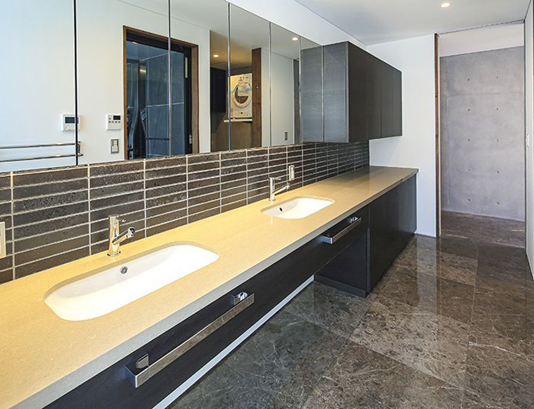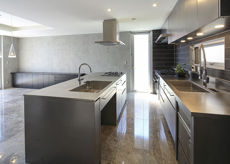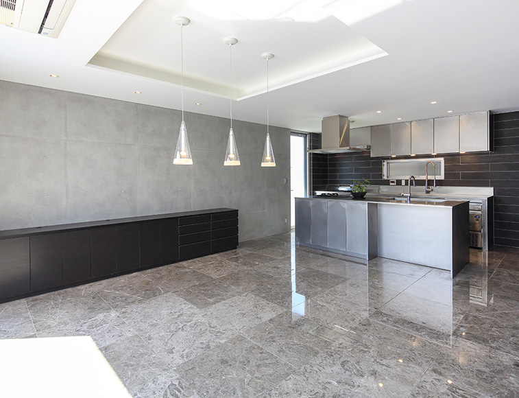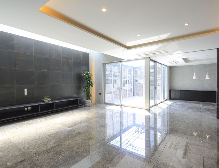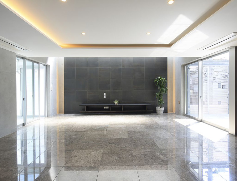 東南の角地に建つ、延べ床480m²の4階建て外断熱RC住宅です。幾何学的な外観に、大小の大理石やタイルを配した内装、6mを超えるワイドなトップライトから柔らかい光が差し込むリビング、オールステンレスのシステムキッチン、サウナ、ジャグジー付きのラウンド型バスタブ、フルオーダーの洗面化粧台と、意匠にも、素材にも、徹底的にこだわった邸宅です。