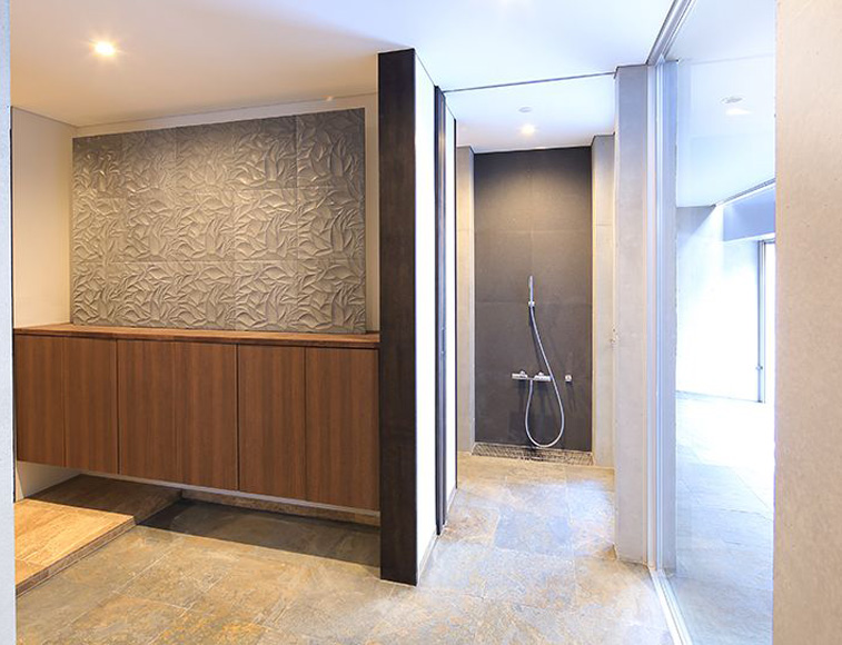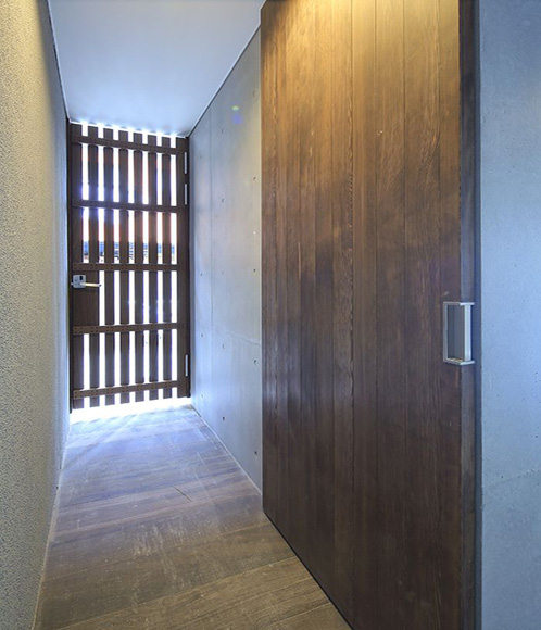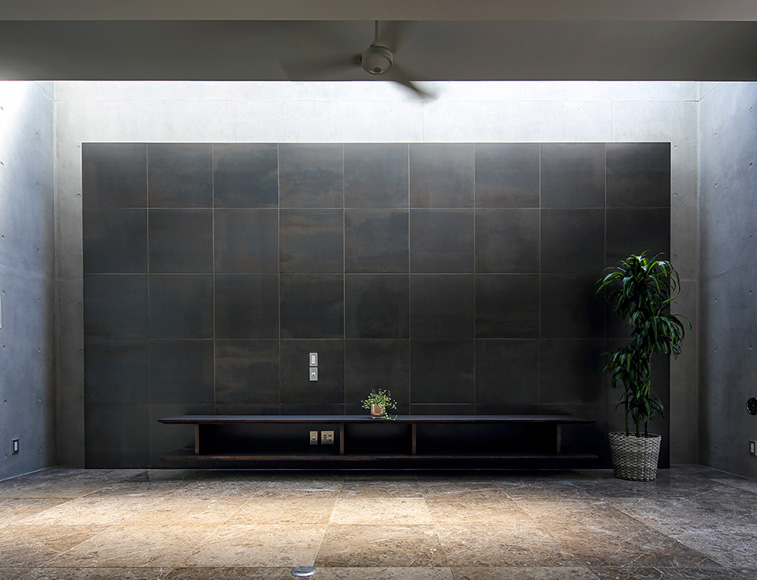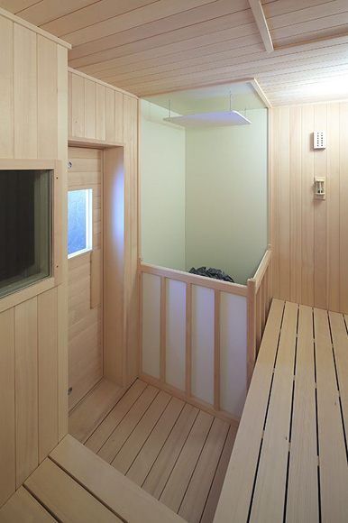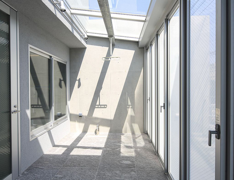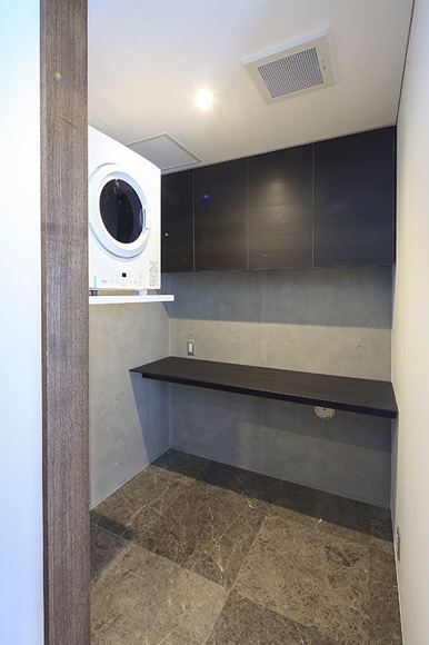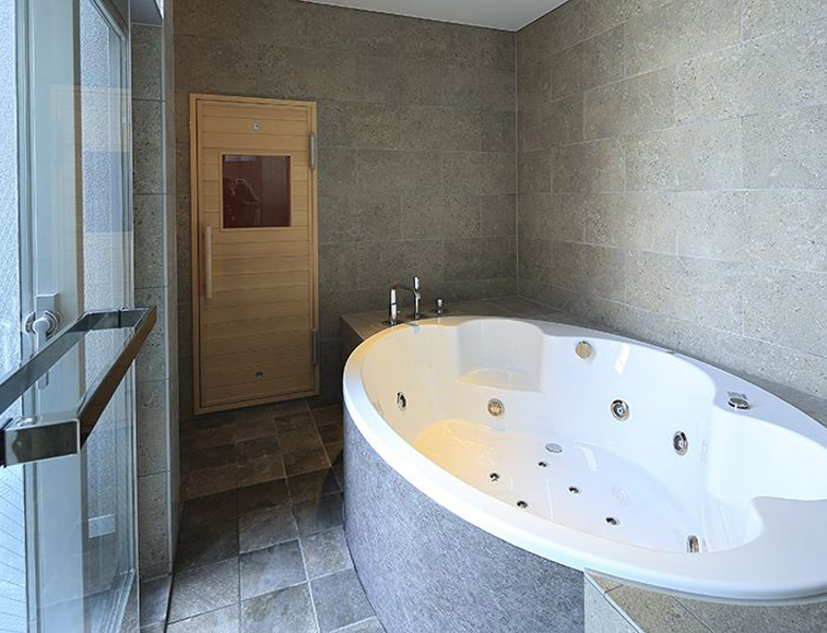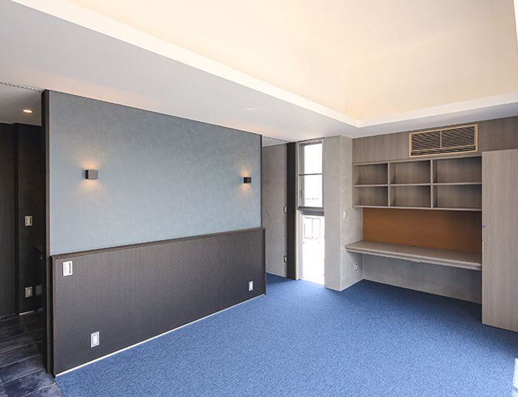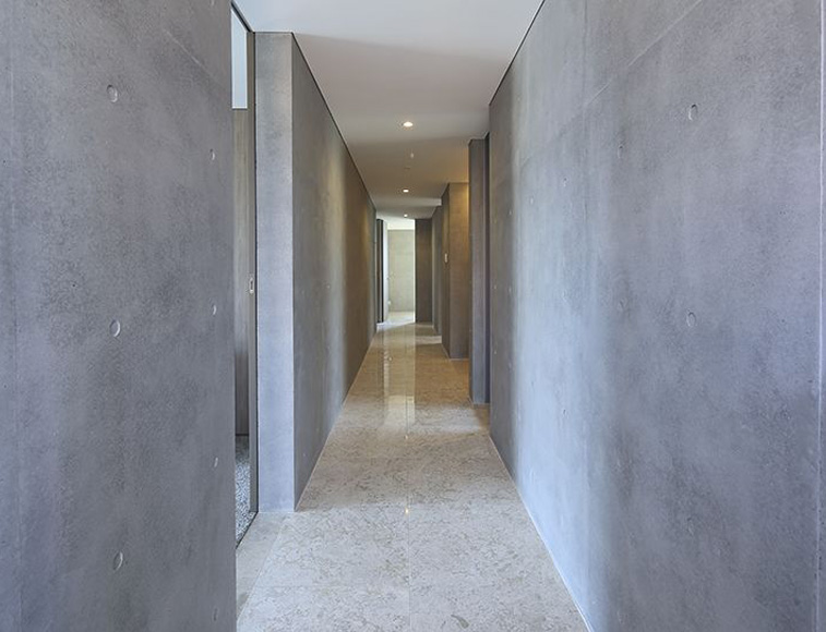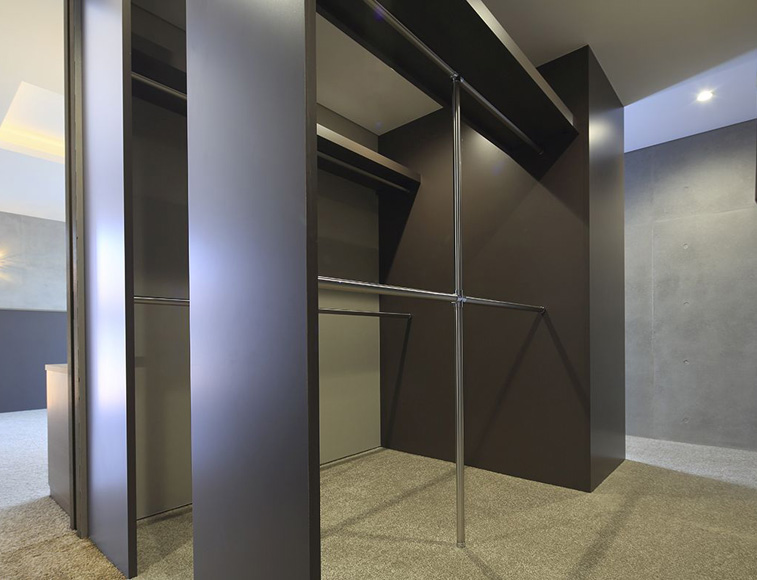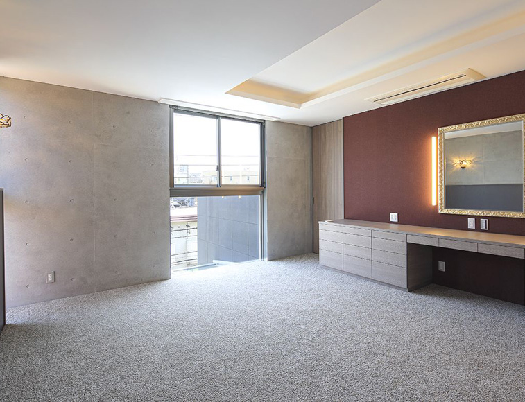 1階は3台のガレージに、お客様を迎える応接室、2つのプレイルームにドッグハウスを設置。2階はメインのダイニングキッチンとリビングに、サンルームを併設したサニタリーを。3階には居室とクローゼットを集め、4階にシアタールームとルーフバルコニーにつながるジャグジー&サウナを配しました。外断熱RC住宅の特長を生かし、廊下や居室の壁面の一部は、コンクリートの打ちっぱなしで仕上げています。