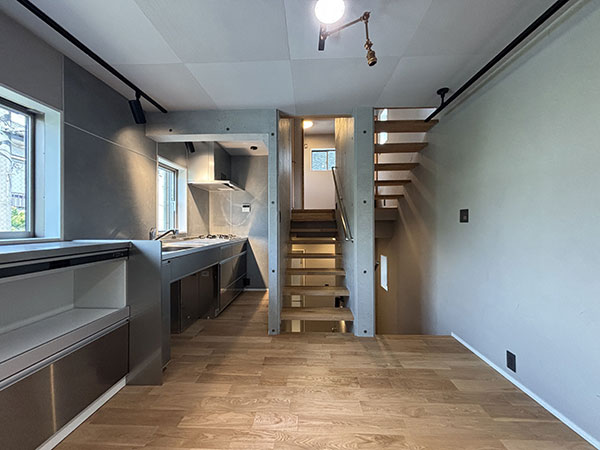 このお住まいの特徴は、まずフロアの多さ。地下、1階、中2階、2階、中3階、3階、屋上と、7層にもなります。一方で、土地の形状は、南西の角に面するものの、間口が広くありません。それゆえ、2つの課題をクリアする必要がありました。