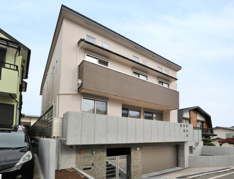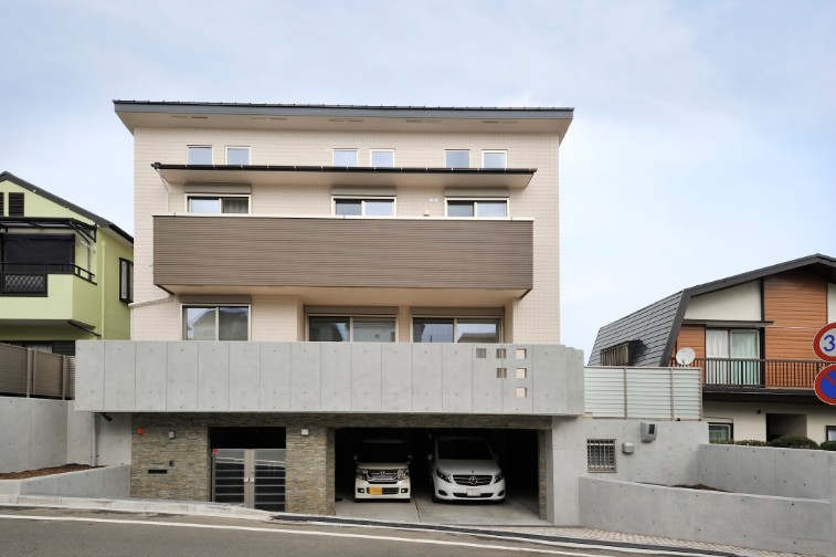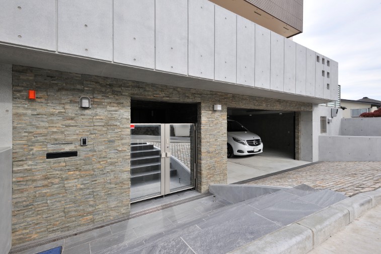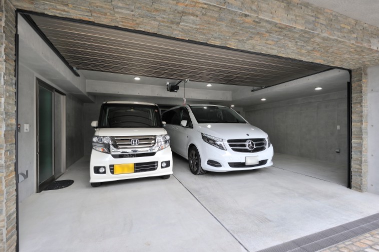 前面道路と敷地に高低差のある土地に建てた、地下室・地下車庫のある家です。約230m²の土地に地下車庫も合わせて300m²を超える床面積を確保しました。地下車庫の奥には、半ソトのアウトドア用品などをしまえる物置を用意しました。2つある地下室の1つは、壁や天井に音を吸収する建材を使い、音楽室として楽器演奏やカラオケなどを楽しめる部屋にしています。