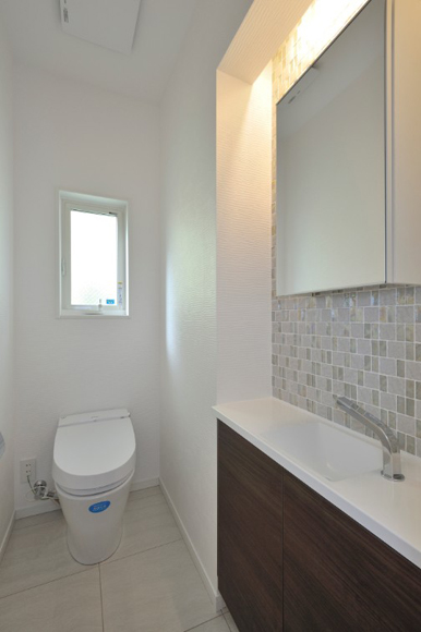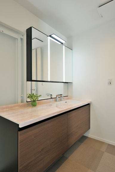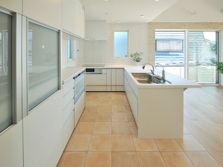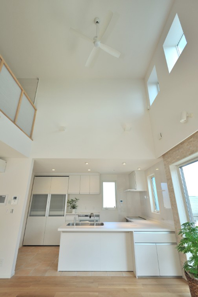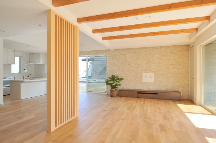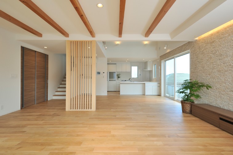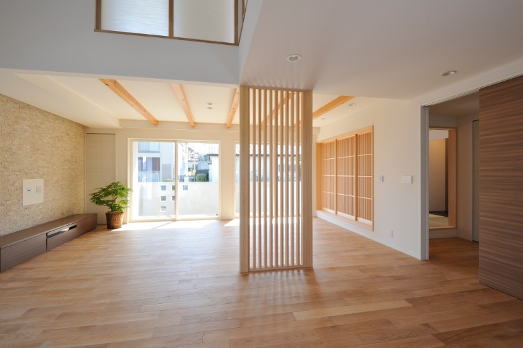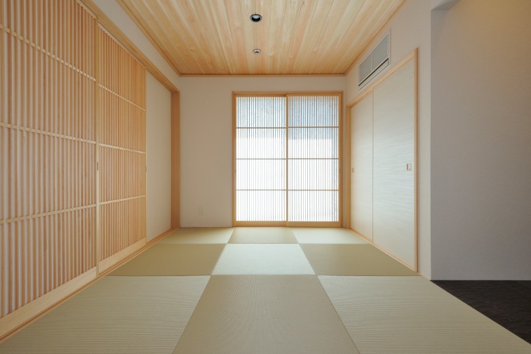 1階は32帖のLDKにダイニング部分を吹き抜けとしたので、開放感抜群の広々空間となっています。さらにリビング奥には客間にもなる和室7帖を設置しました。建具の障子には、和紙の趣ある風合いや独特の質感を最大限に生かしながら、破れやすい、燃えやすいという弱点をラミネート技術で克服した、『ワーロン』を使用しています。