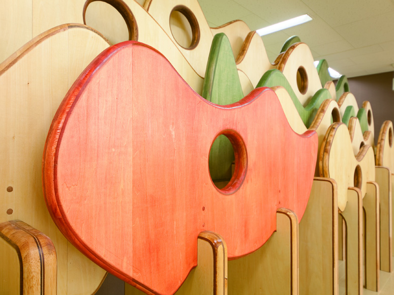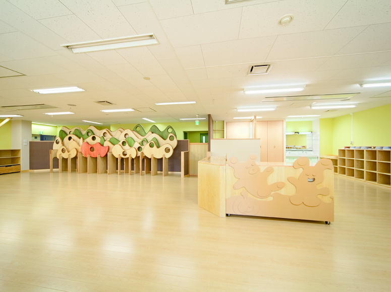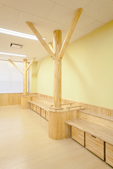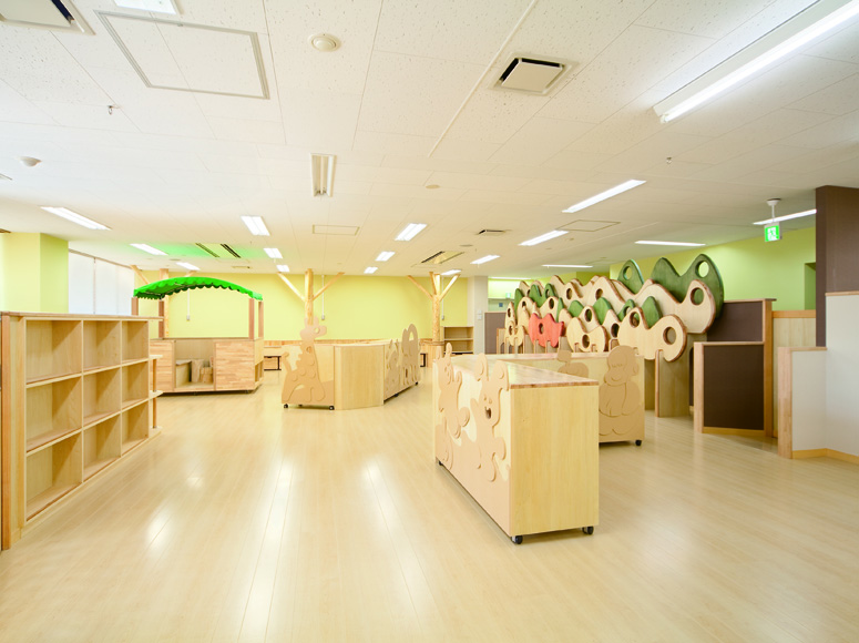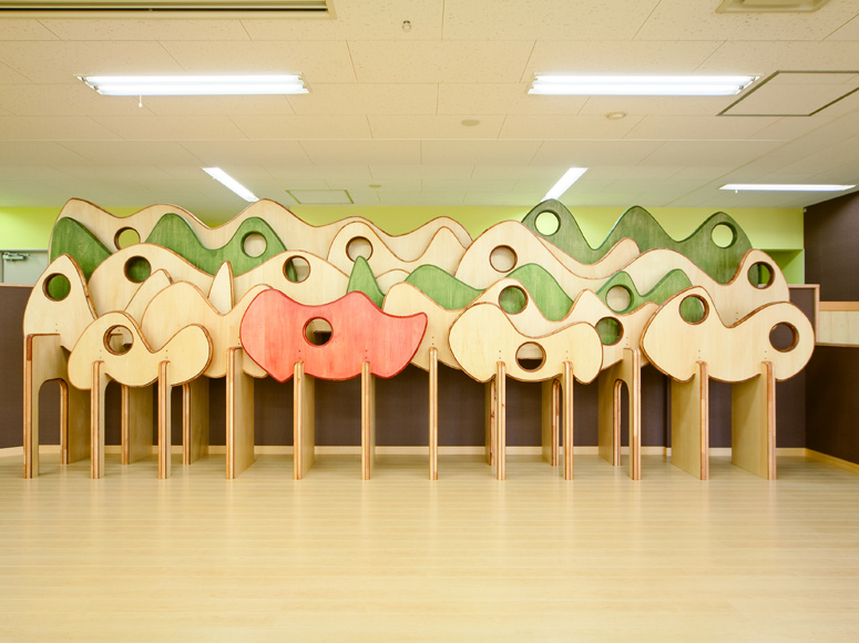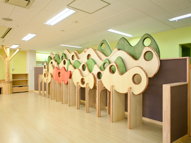 横浜市栄区の子育て支援拠点『にこりんく』のオブジェや遊具の工事です。鉄やコンクリートは、ある程度思いのままの形が作れるものですが、加工が難しい天然の木を用いてオブジェや遊具を創る、しかも子供たちの成長を手助けする施設ということでやりがいを感じ、入札に参加しました。メイン写真に写る『森のオブジェ』は14枚のそれぞれ形が違う板を組み合わせて、幻想的なオブジェが出来上がりました。杉の一本木を使った木のベンチでは、手すりも天然の木を曲げてつくっています。