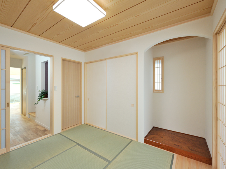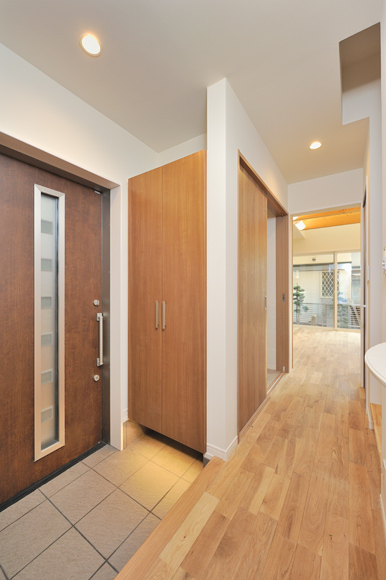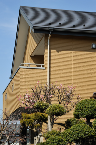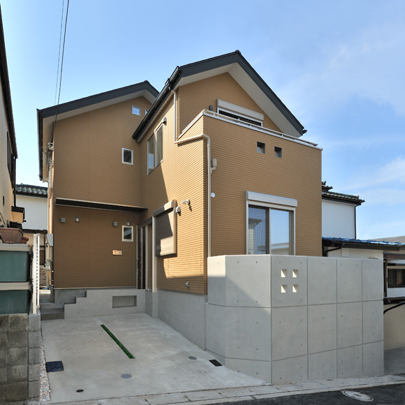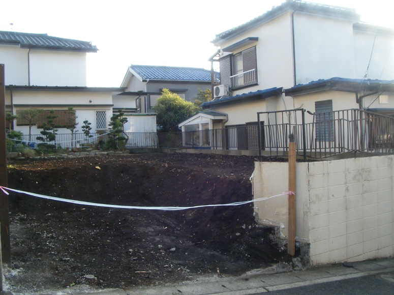 現地は、建ぺい率50%容積率80%の低層住宅地。前面の北道路が2m程下がっています。「北側道路だから部屋が暗い。明るいリビングにしたい。また、道路から玄関までの階段が急でこわい。荷物もおける緩やかなエントランスにして欲しい。」