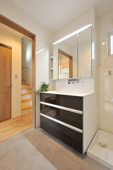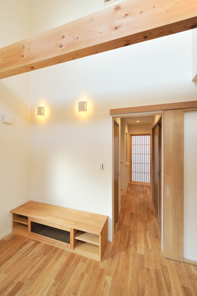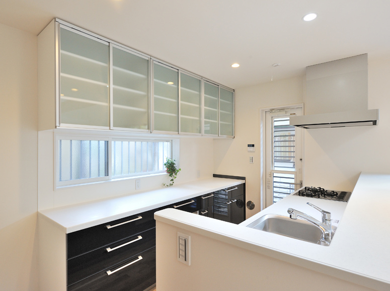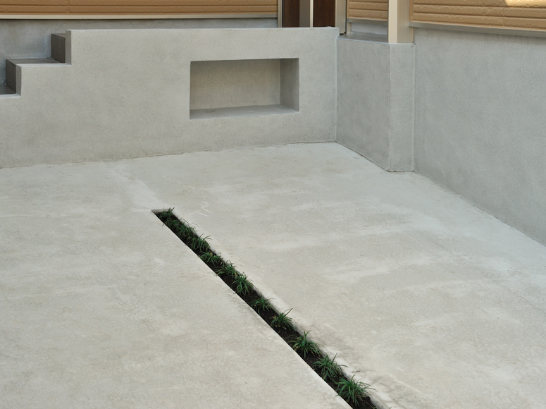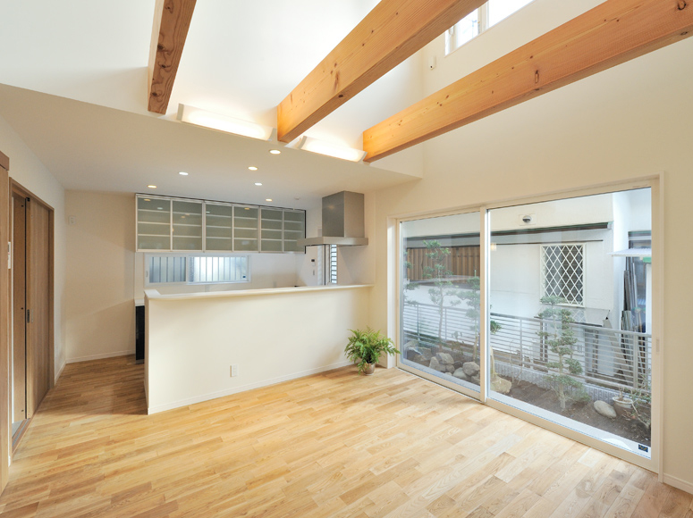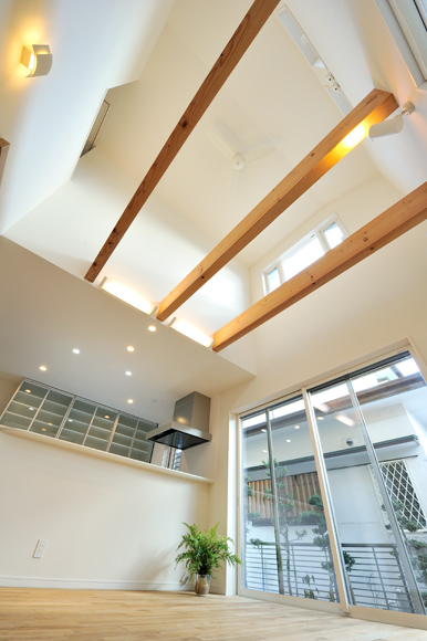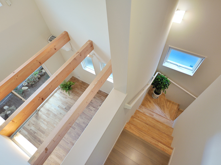 建て替え前は、道路わきの急な階段を高低差1.8m登り降りしなければなりませんでした。そこで、玄関の位置を替え、カースペースをスロープに見立て、その奥からゆるい階段をつくることで負担を和らげました。玄関前に踊り場を設けて扉は引き戸にし、屋根もつけたので安心して出入りができます。住宅密集地の1階は、南側でも光が入りにくいもの。また、建ぺい率50%容積80%の場合、2階は1階と同じだけの床面積は確保できません。この2つの弱点を、リビングを吹き抜けにすることで解決。吹き抜けリビングとすることで、容積を増やさずに、1日中光の入る気持ちのいいリビングを実現することができました。
