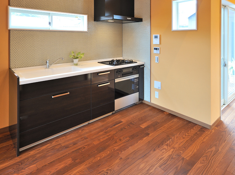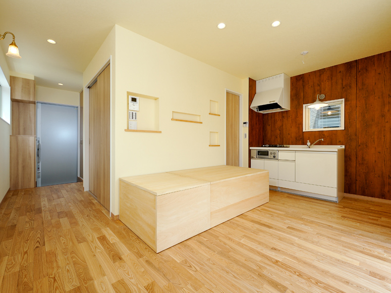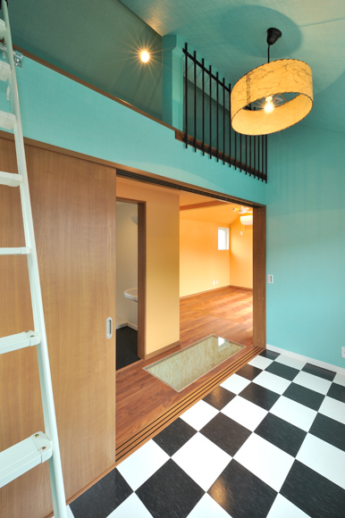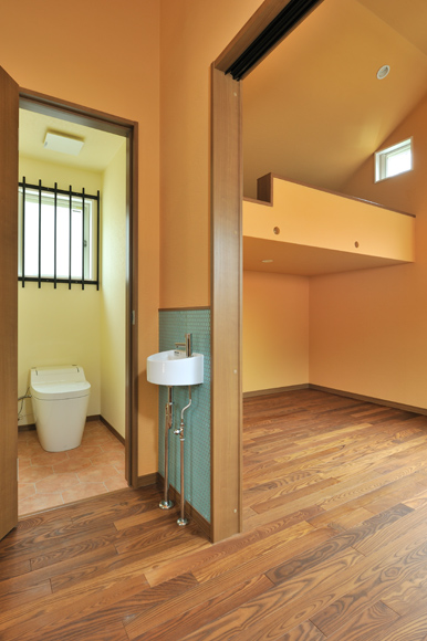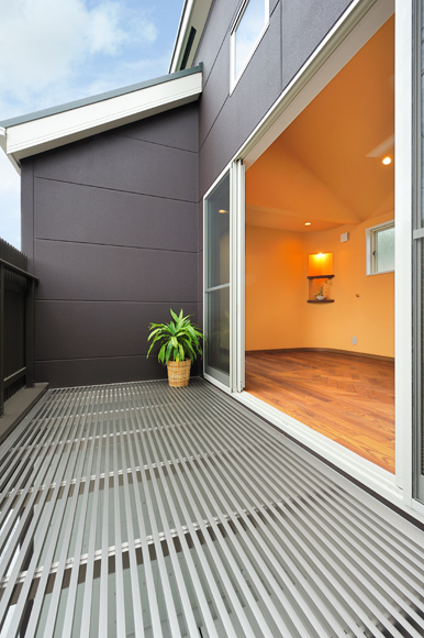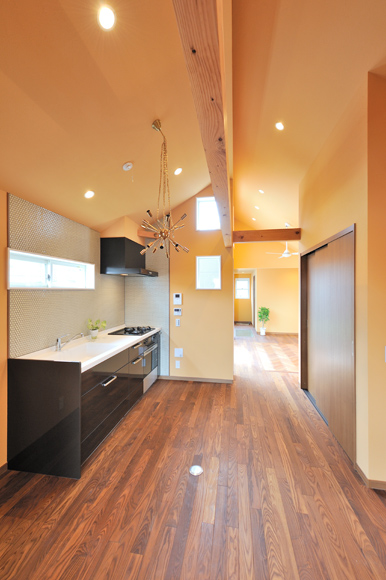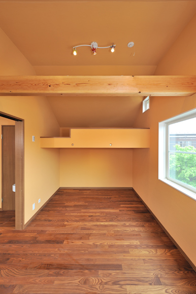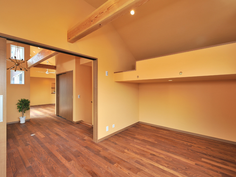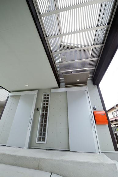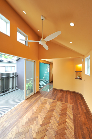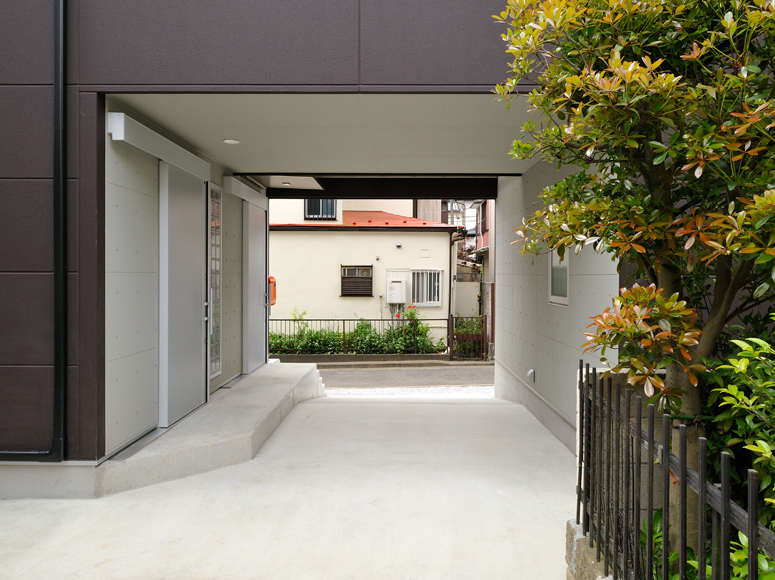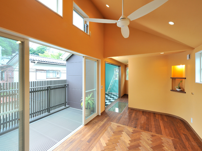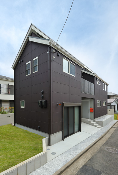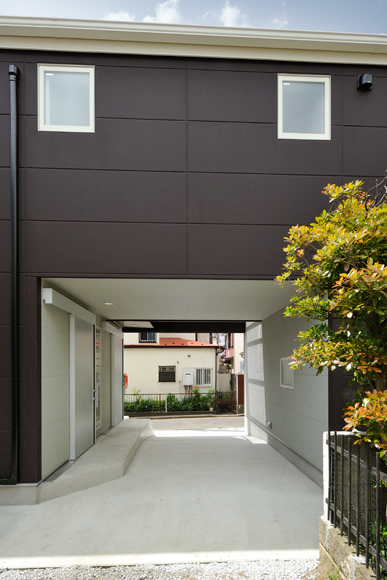 前面道路が狭く、正面からの駐車ができないため、車の出入りは裏の私道から行うしかありません。また、間口は広いものの、奥行はかなり狭い土地。その条件の中で、親世帯・子世帯それぞれの居住空間とバイク置き場を配置するため、建物中央にトンネルガレージを配置し、その東側はお母様のお部屋、西側はガレージとして、音の問題にも配慮しました。2階の子世帯は、1フロアをできるだけ広く感じられるように、バルコニーをリビングにつなげ、屋根形状まで広げた天井で開放感を確保し、居室にはロフトも作って、有効面積を確保しました。
