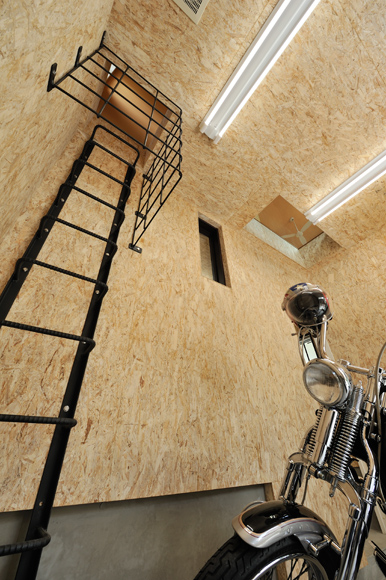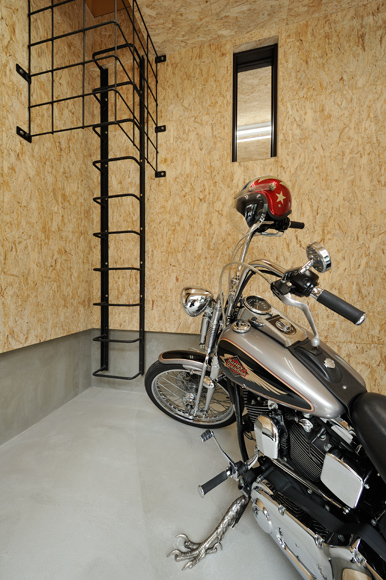 バイクをこよなく愛するお施主様が建てたガレージハウスです。室内でエンジンをかけられるよう、換気扇と可動式のダクトを用意しています。リビングとガレージを繋ぐ梯子は、既製のステンレスではなく、鉄筋を加工して作りました。ご夫婦のお好みであるアンティークな味わい深いテイストに合わせたのですが、実はコスト削減にもつながりました。