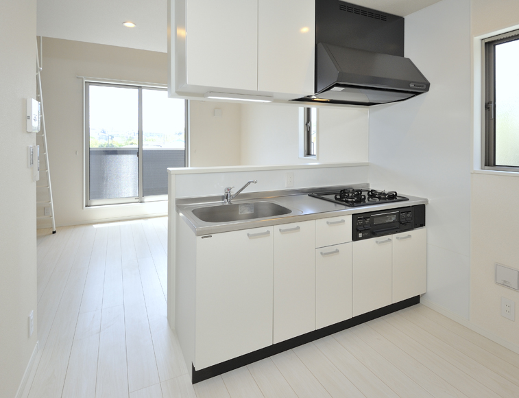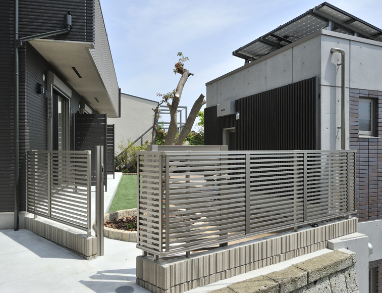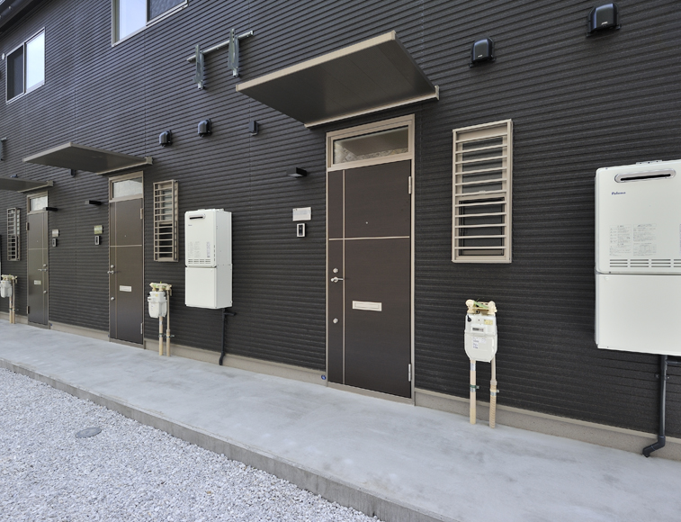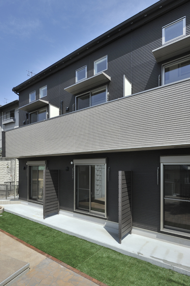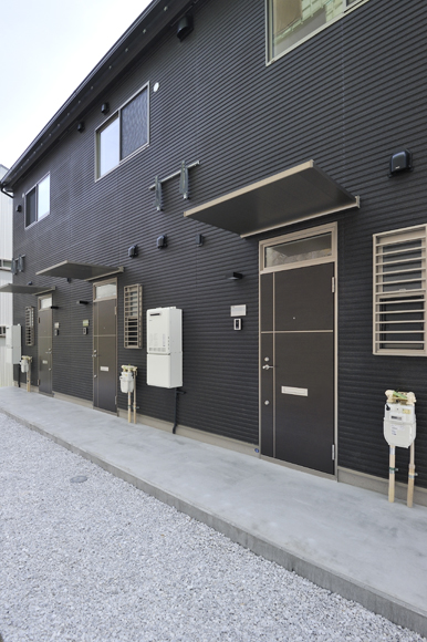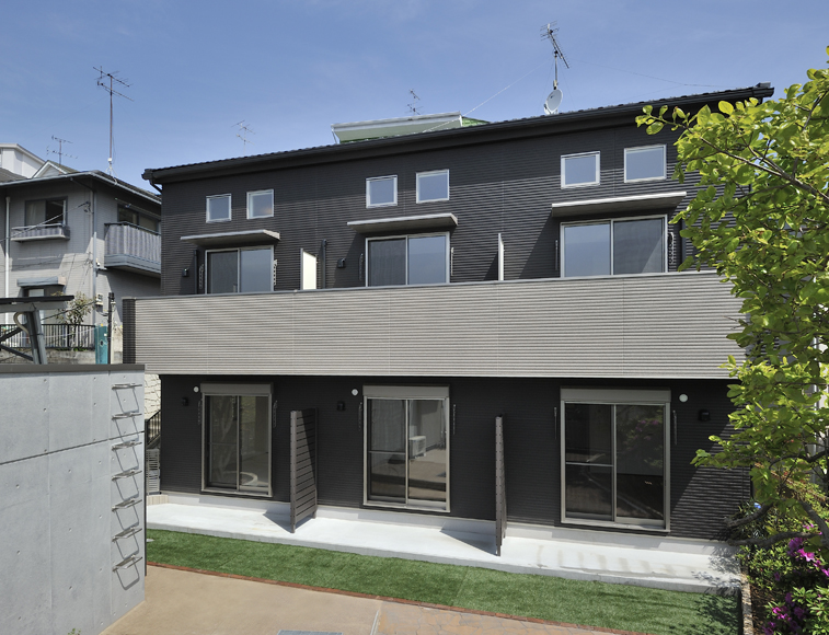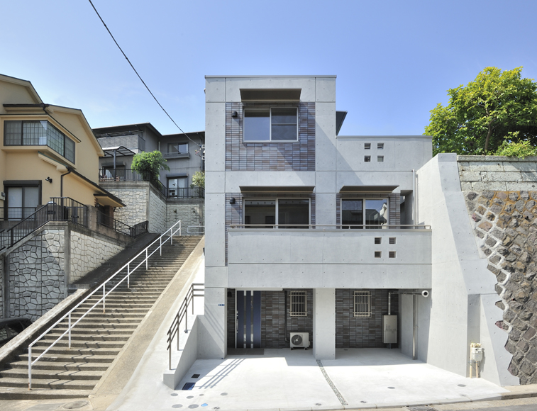 2015年に新築した『地下室地下車庫のある家』と同じ敷地に建つ賃貸住宅です。当時新築した住宅は、庭先と崖地に道路と敷地の高低差を活用して建てたので、元あった家の敷地がまるまる空きました。そこに今回の賃貸住宅を建てました。2LDK+ロフトのファミリータイプ3世帯分あります。1世帯が1-2階を使用するタイプなので、上下階の騒音が気にならず暮らしやすいプランです。