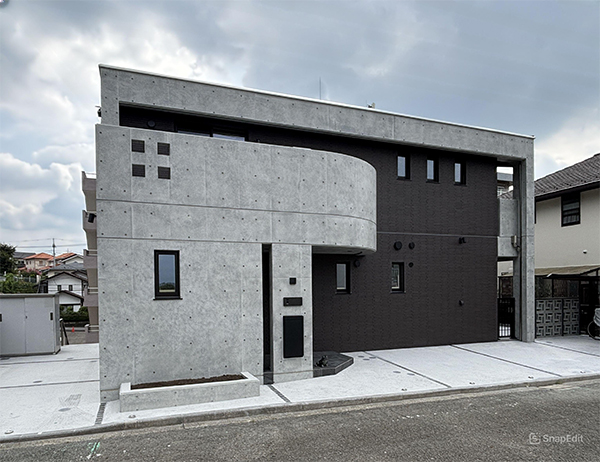 外観正面は、一部にアールをあしらったコンクリート打ちっぱなしとボーダータイルでツートンに。南側は、住宅らしさが出る切妻屋根と、建物の引きにより、奥の深い意匠に仕上がっています。