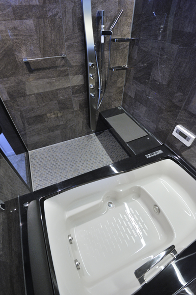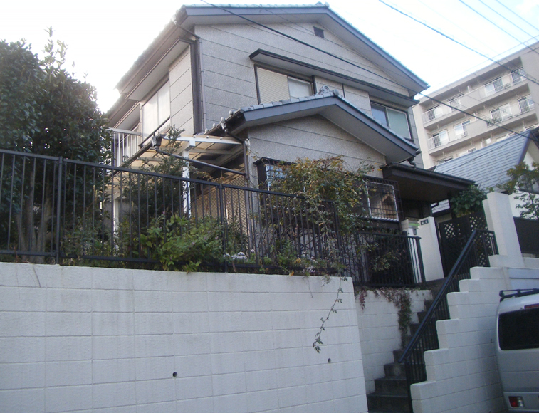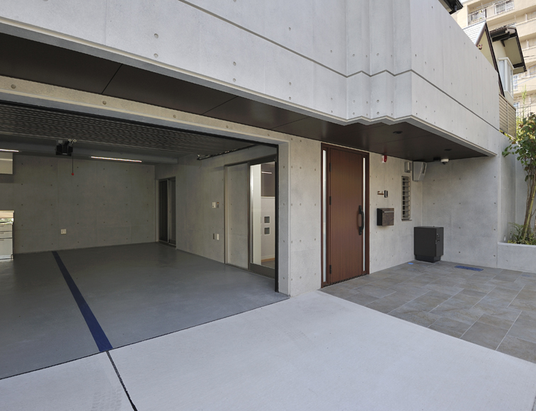 建て替え前は、前面道路ギリギリに擁壁がありましたが、地下工事の際に擁壁の位置を車一台分下げて、来客用駐車場を確保するランドプランにしました。前面道路と建物に「間」ができましたので、余裕が感じられます。 地下車庫は、2台分の駐車スペースに流し台を置いて、ガレージ兼ご主人のホビースペースとなりました。