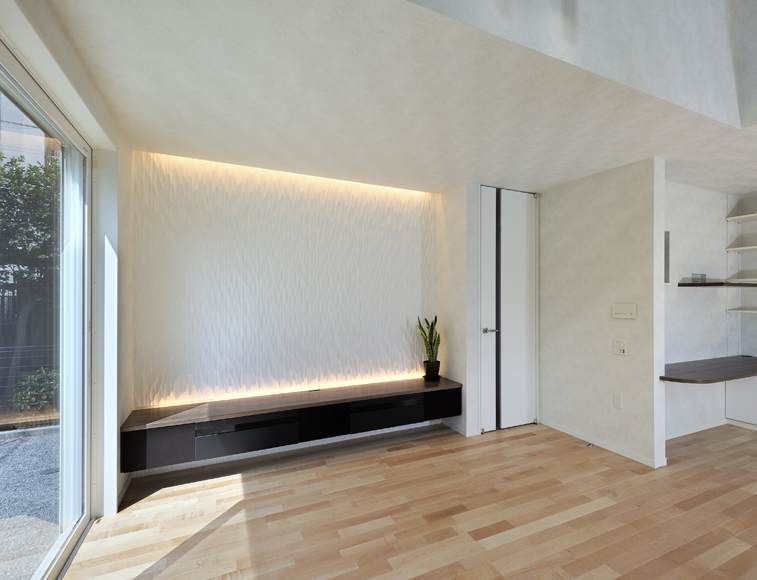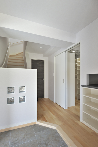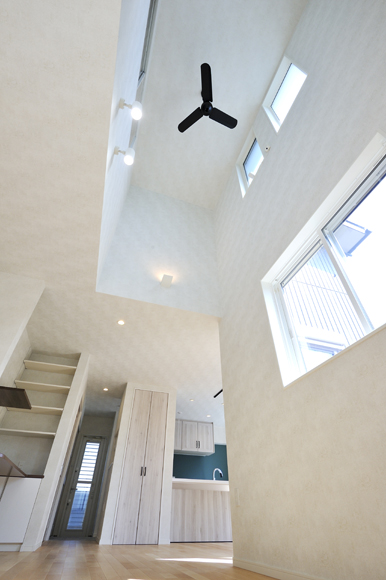 玄関には、アクアリウムを楽しむ BOX を設置し、裏手には幅約 3.6mのシューズクロークをご用意。子供たちが独立した後には、半分を残してエレベーターを設置できるようにしています。 1階リビングは吹き抜けにしてハイサイドサッシを採用し、通常では陽が入らない建物内部まで光を採りこみました。とても明るい空間に仕上がっています。