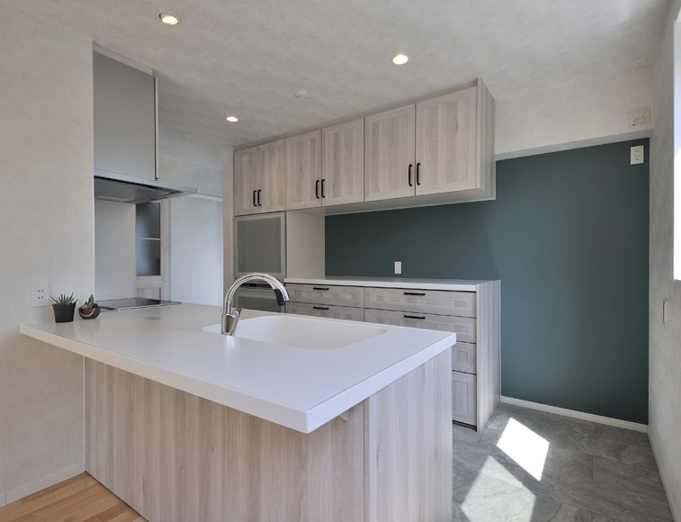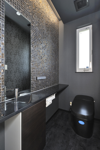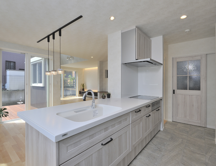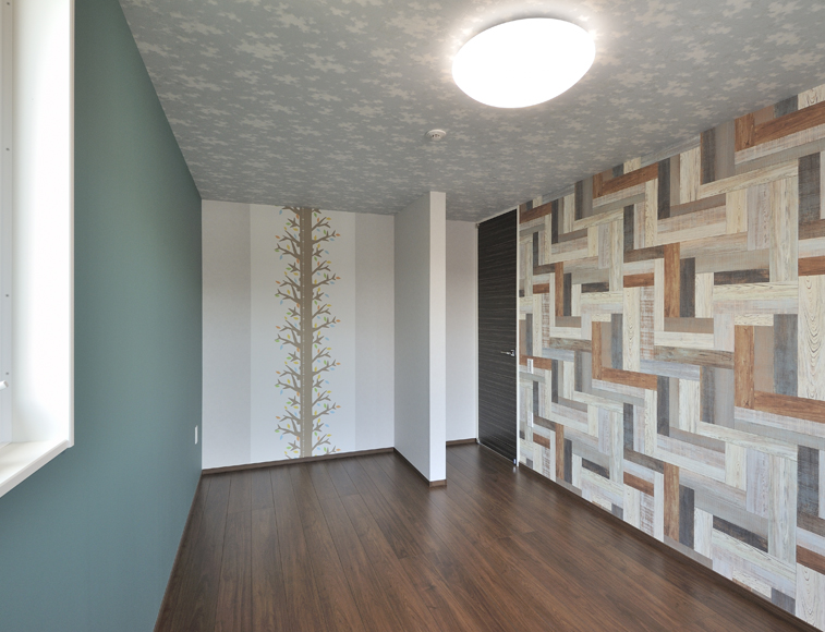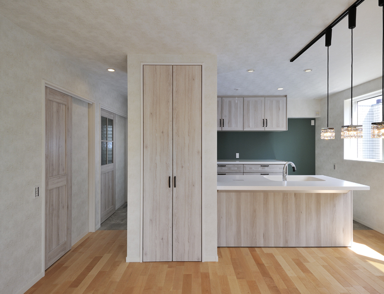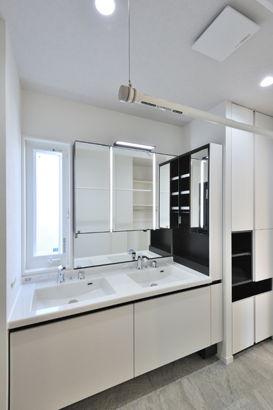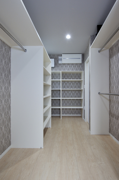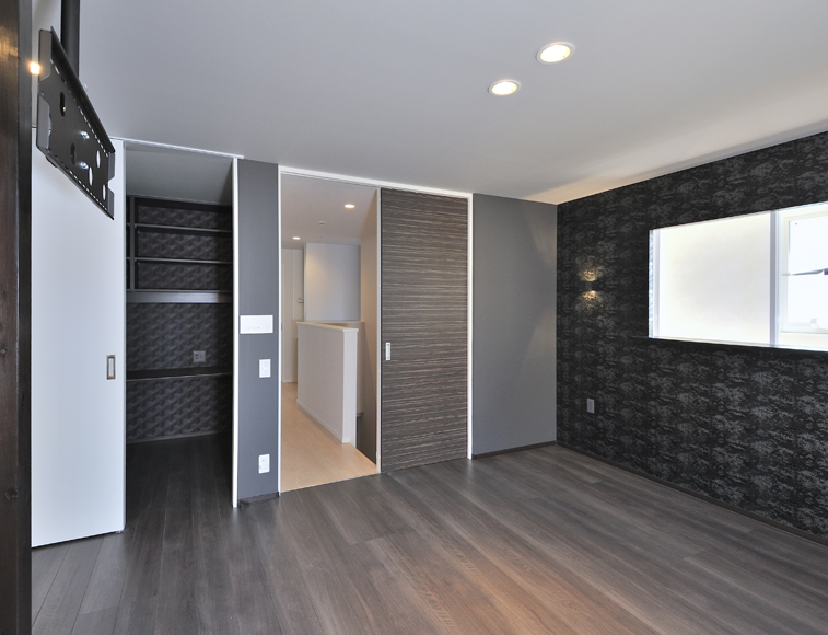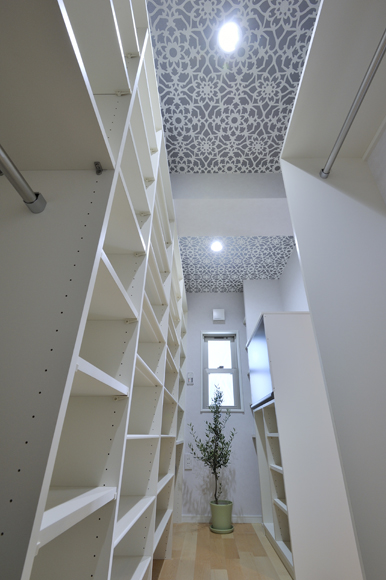 リビング裏手には、ファミリークローゼットを設け、家族の衣類をまとめて収納します。個室にはクローゼットを設けず、広い空間を確保しています。 子供たちは遊びも宿題もリビングで行います。ご夫婦が 2 階にいるときも、縦につながり気配を感じられるように、室内窓をつくりました。 キッチン、浴室、洗面室、トイレなどの住宅設備や、各室のクロスも、ショールームやカタログを御覧になって1つ1つ吟味し、気に入ったものをお選びいただきました。「したい暮らし」を実現する、お手本のような家づくりでした。