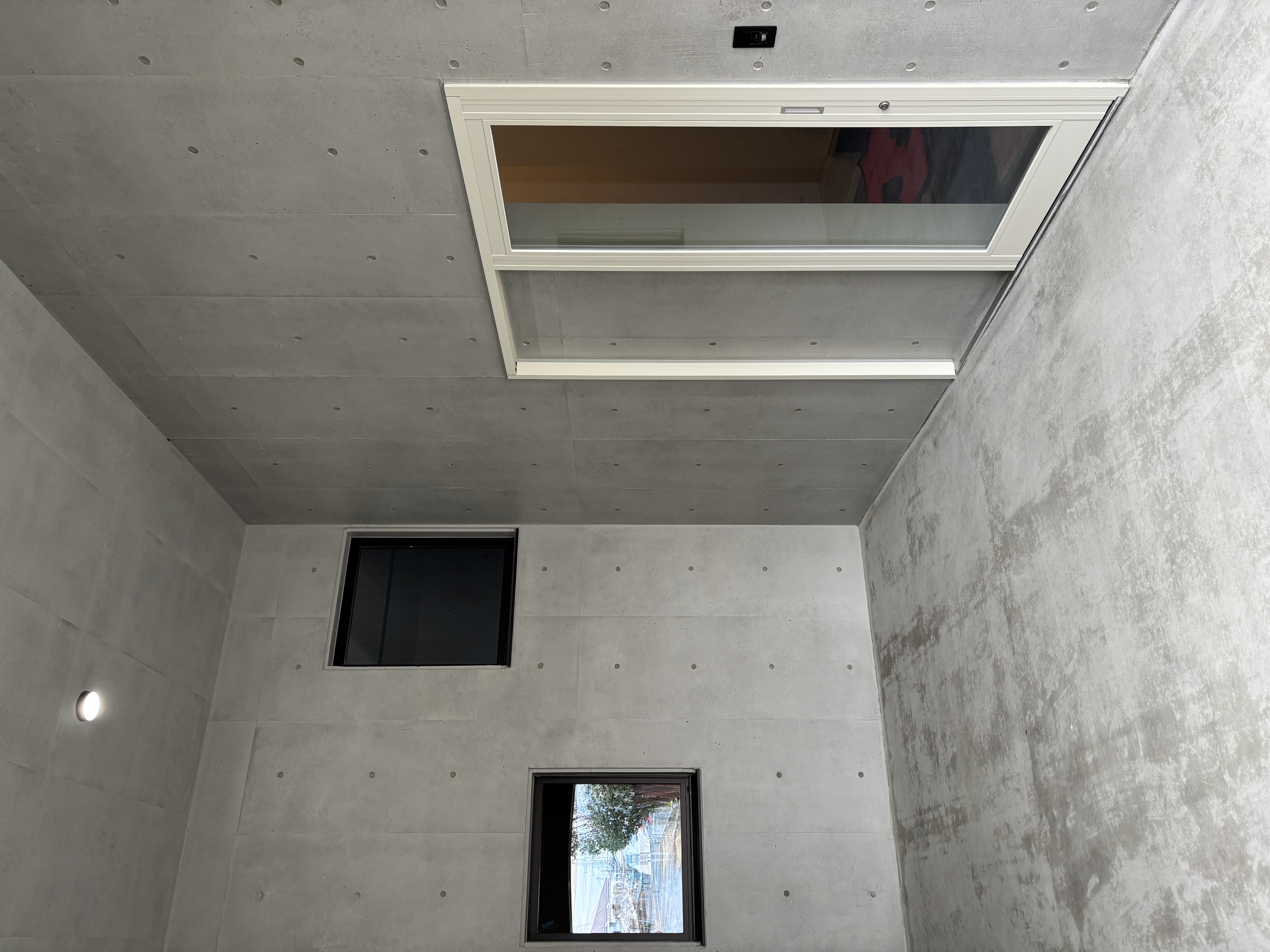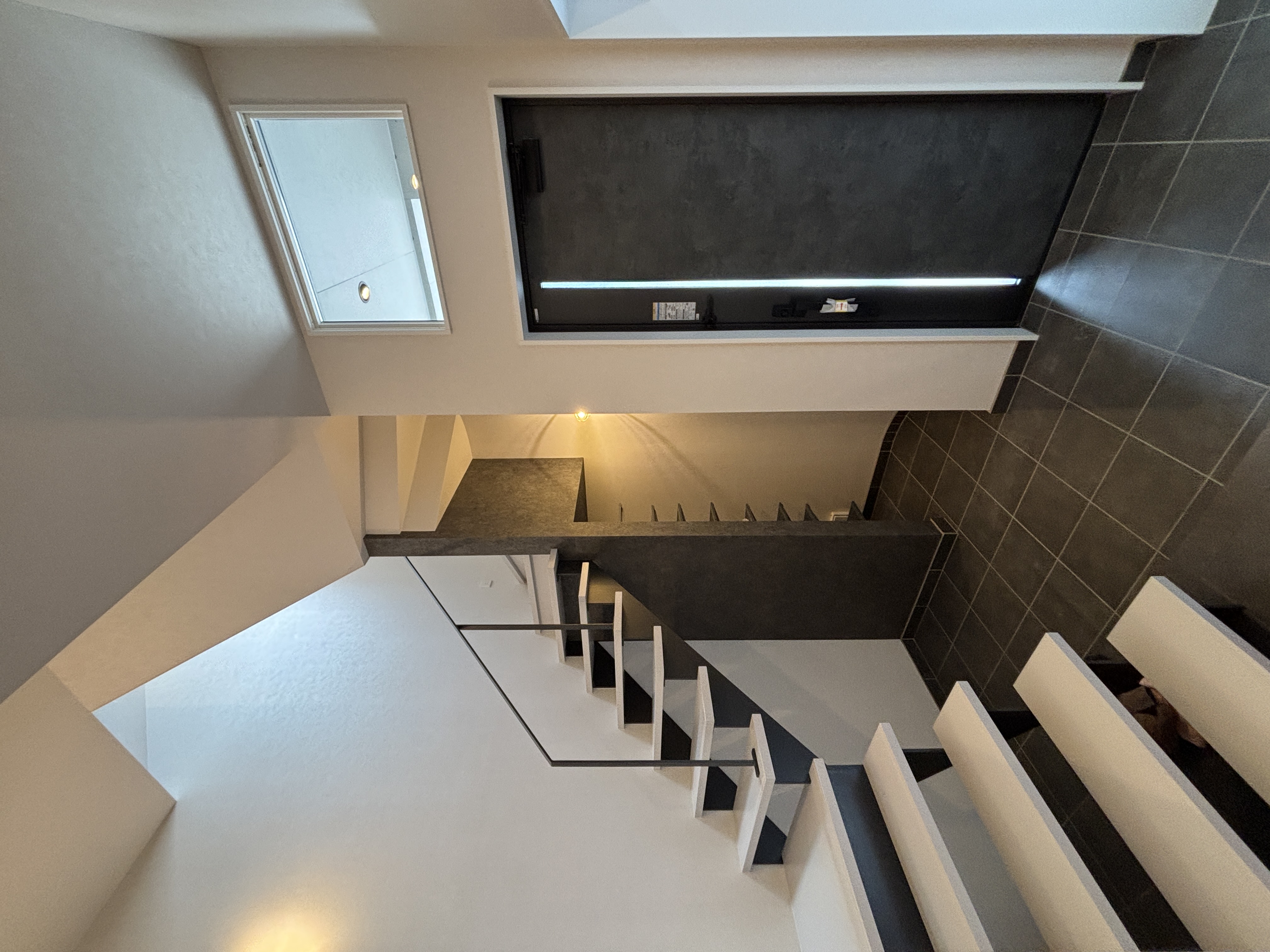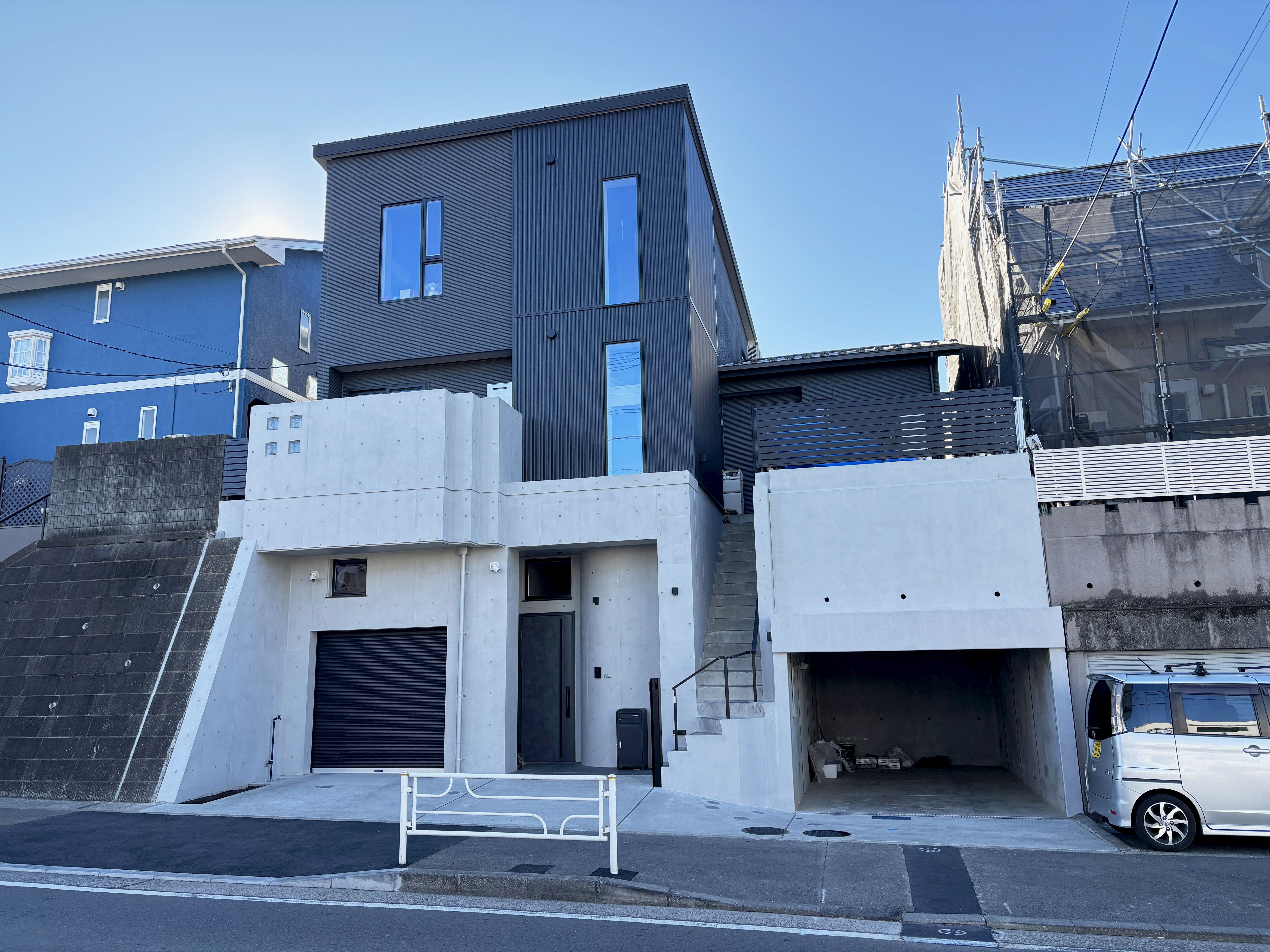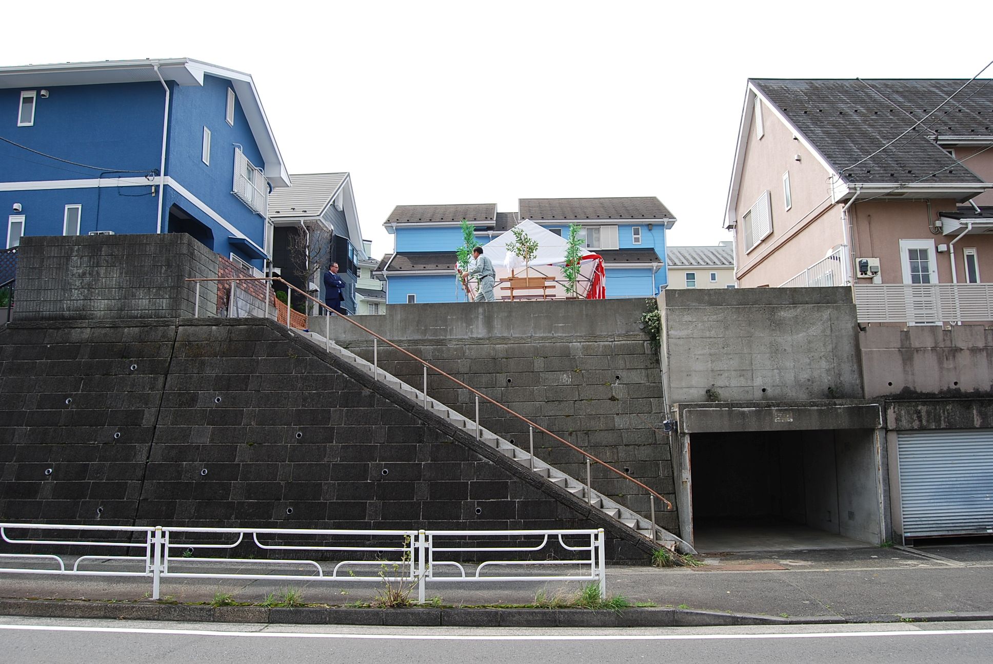 道路との高低差が4〜5mある敷地に建てた地下室地下車庫のある二世帯住宅です。敷地の西側に、お隣様と並んで造られたボックスカルバートと呼ばれる地下車庫がありました。これを解体して造り替えるのは困難と判断、既存のまま活用して東側に地下室と地下車庫、及び車庫と内部で行き来できる玄関を設置しました。