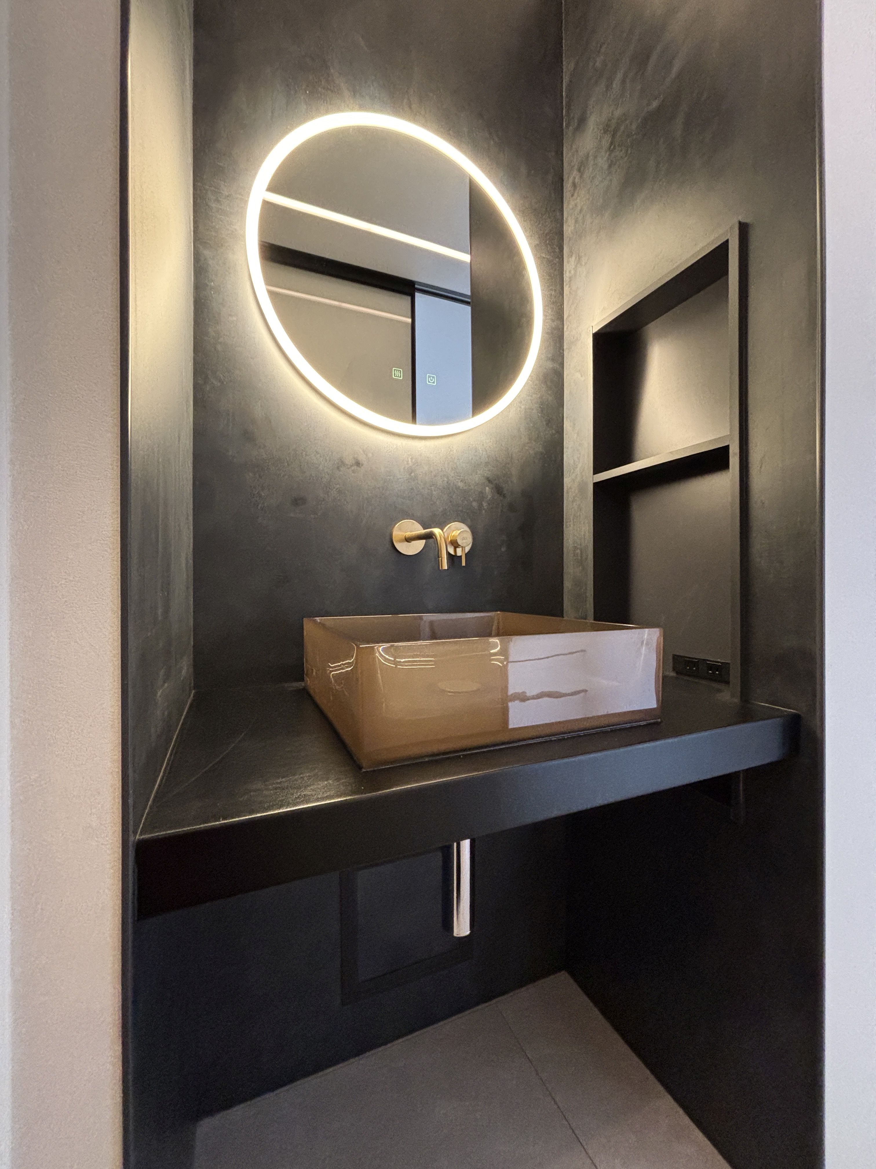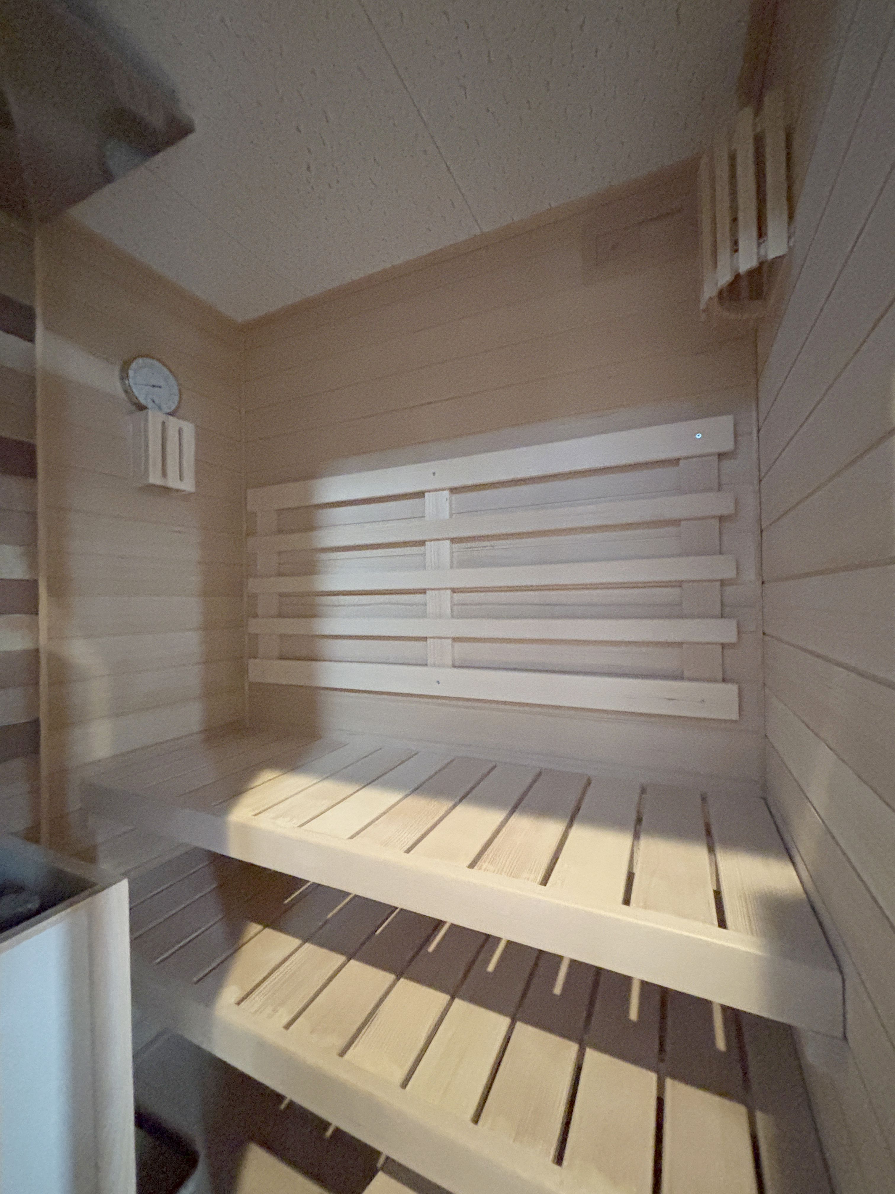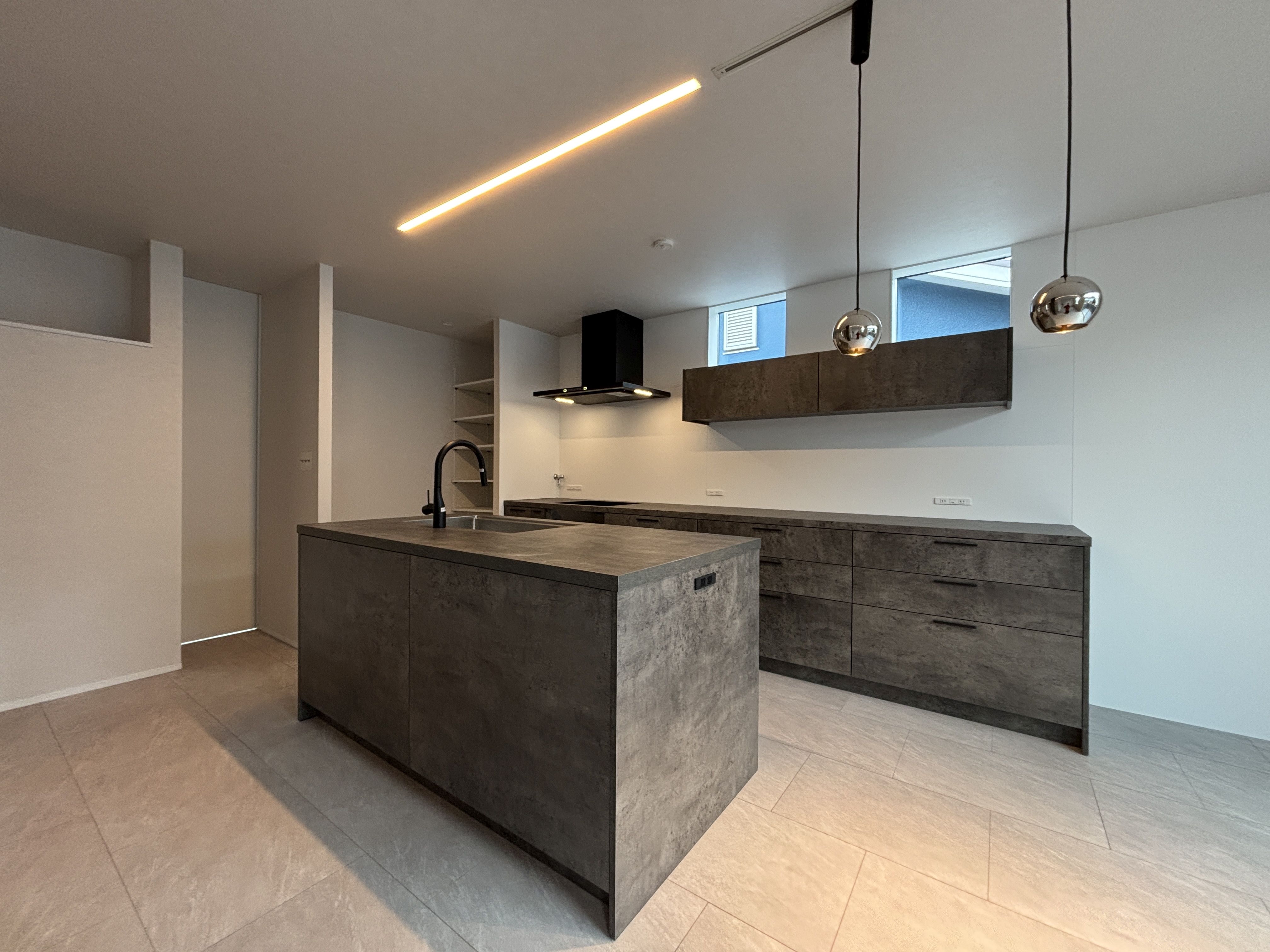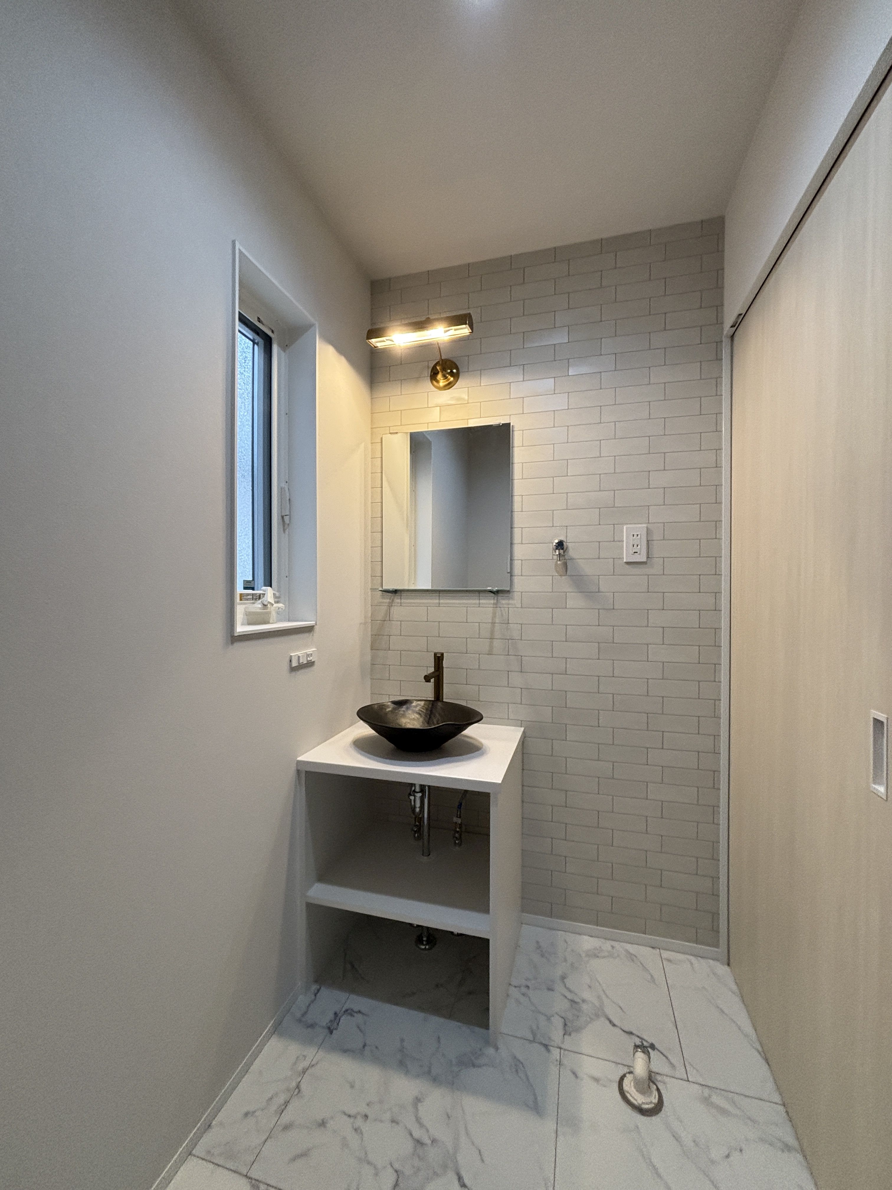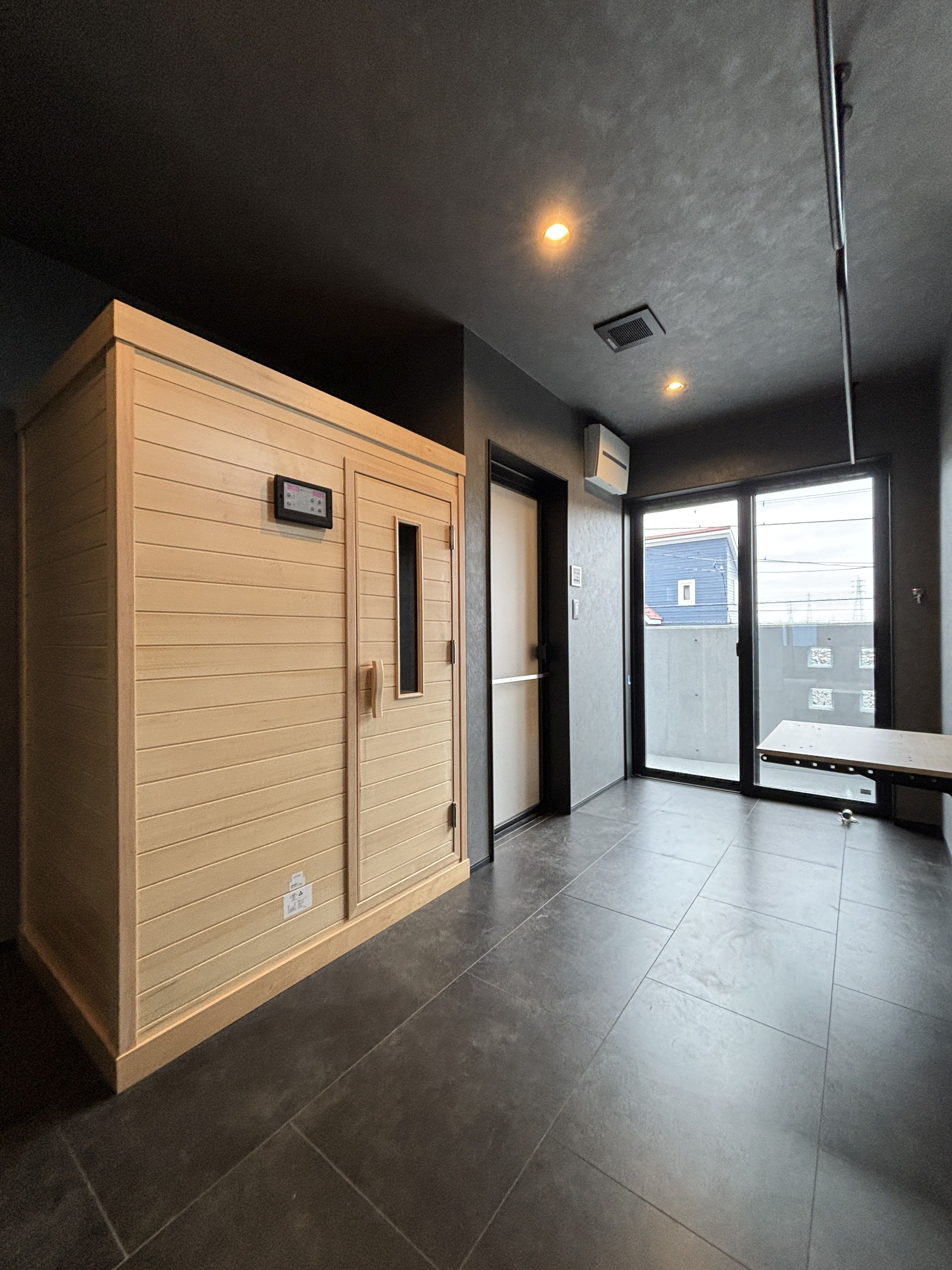 楽器の演奏を趣味に持つご夫婦が、お二人でセッションを楽しめるよう、地下室は音楽室として利用できるようにしています。1階のサニタリールームにサウナを設け、バルコニーには水風呂を設置できるように準備しています。親世帯子世帯が気兼ねなく暮らせるように、玄関、キッチン、浴室、洗面室と全て別々にして、親世帯の上には2階を設けず、子世帯の生活音が下に響くことがないように配慮しています。