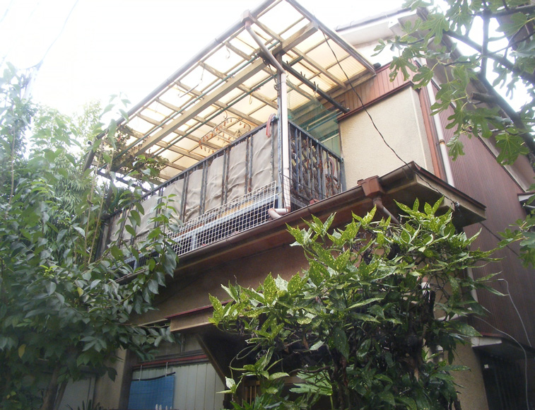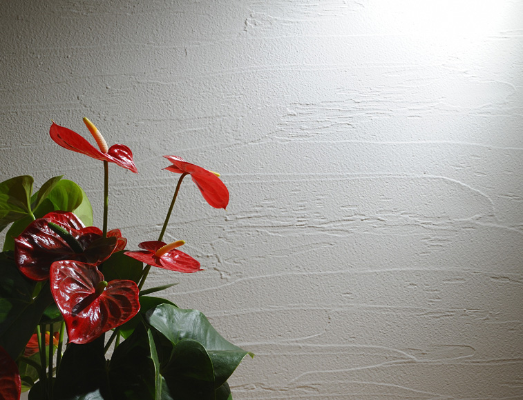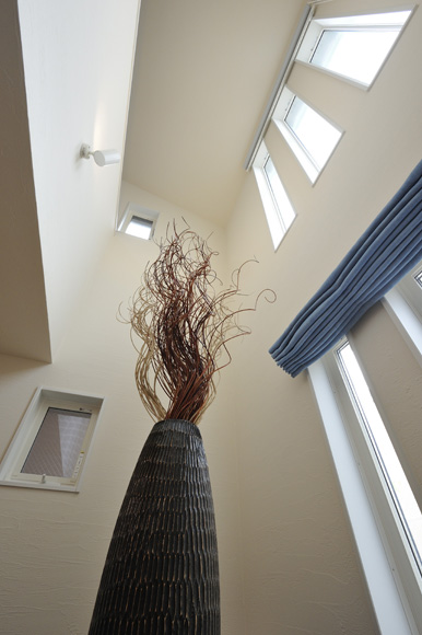 50m²に満たない土地に建つ、延床55m²ほどの住まいです。ご夫婦+ワンチャンの家族構成なので、広さに不足はないものの、狭く感じさせない工夫が必要でした。そこで、1階リビングと2階寝室を吹き抜けでつなぎ、2階の天井を勾配天井にすることで、開放感を演出しました。壁面は、調湿性と消臭効果のある珪藻土で仕上げています。コテムラをあえて残す左官職人さんの手業が、主張しすぎない程度にいい味を出しています。セットバックを済ませた外観も、コンパクトでありながら3つのスリット窓と、屋根に覆われたバルコニーの奥行き感、ガンメタリックの色味が相まって、モダンなデザインに仕上がっています。