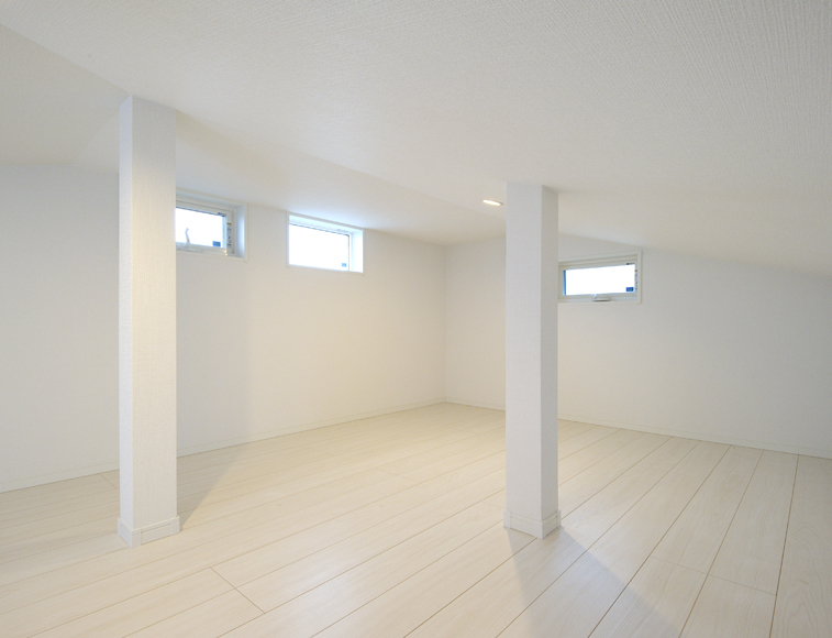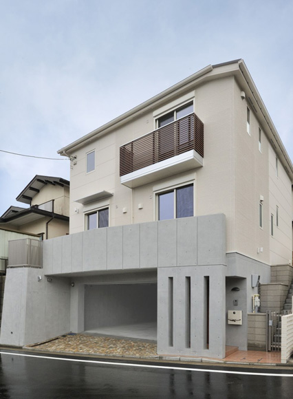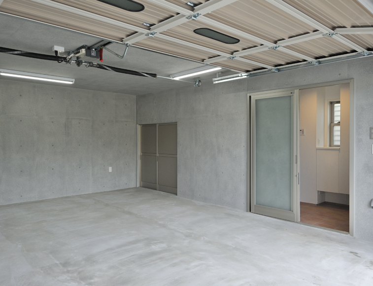 横浜市の高低差のある土地に建てた『地下室地下車庫のある家』です。地下車庫と玄関が内部でつながり、雨でも濡れずに出入りできるプランです。車庫内には、内部の階段下スペースを利用した収納を設けました。生ゴミなどを捨てる際、室内階段を通らなくても玄関先に出られるよう、外階段も使えるように残しました。
