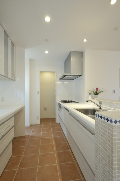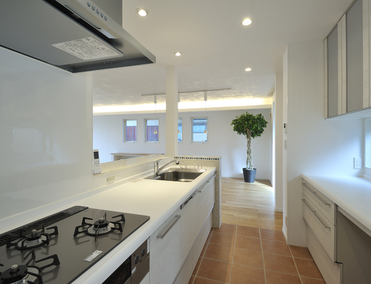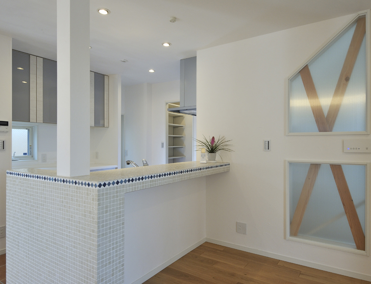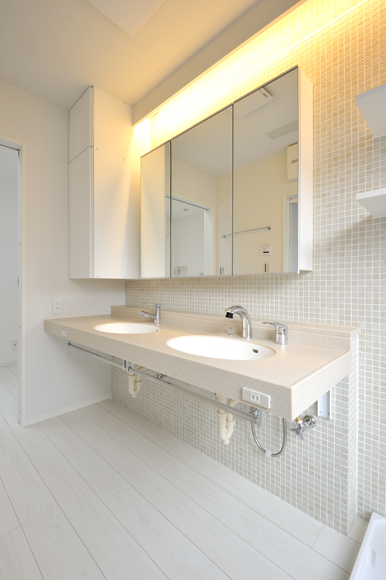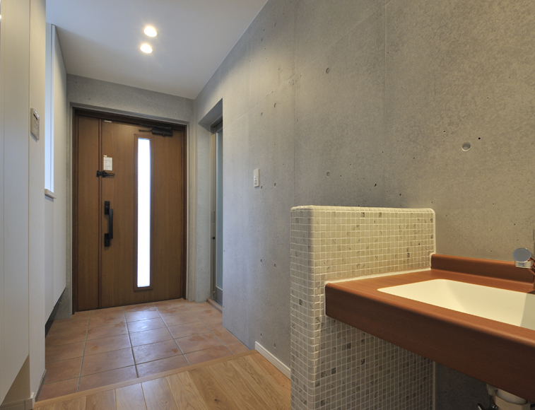 玄関ホールには、帰宅後すぐに手を洗えるよう、手洗い場を設置しています。この手洗い場、1階のキッチン、2階のサニタリールームには、タイルを使用。特にキッチンの一部のタイルは職人が1枚1枚見た目の仕上がりを意識しながら手業で貼りあげました。