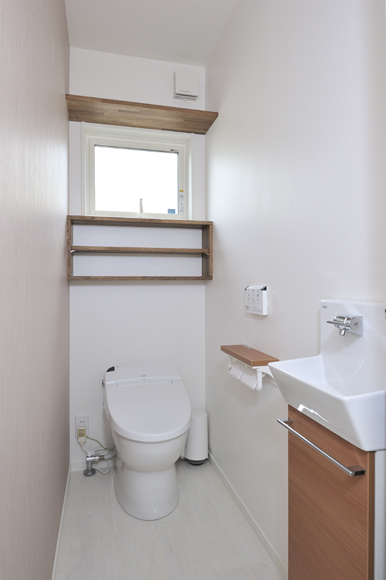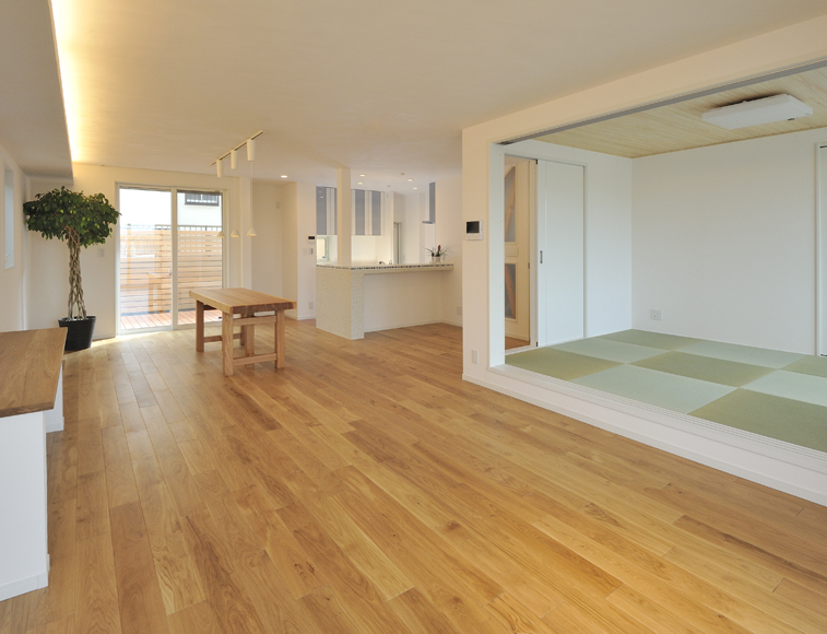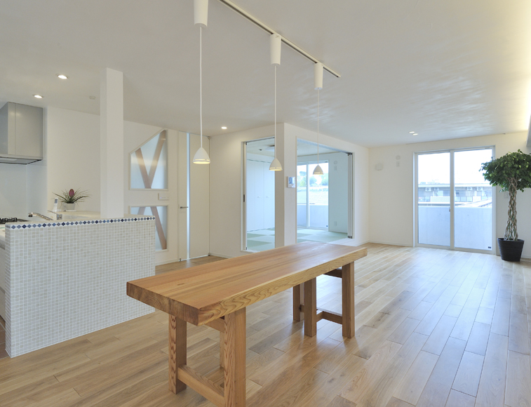 1階の床は素足が気持ちいい無垢のヨーロピアンオークを使いました。壁はドイツの本漆喰、プラネットウォールを使った塗り仕上げです。この素材は、空気中の湿気を多い時は吸い、乾燥している時には放出する調湿性があるので室内を快適な湿度に保ちます。身体にやさしい自然素材を使って心地よく暮らせるようにしました。