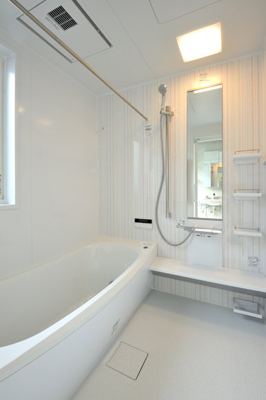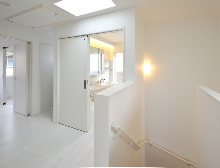 個室と洗面脱衣室、浴室のある2階は間仕切りが多く、中心部に光が届きにくいため天窓を用意。日中は常に明るい爽やかなホールになりました。