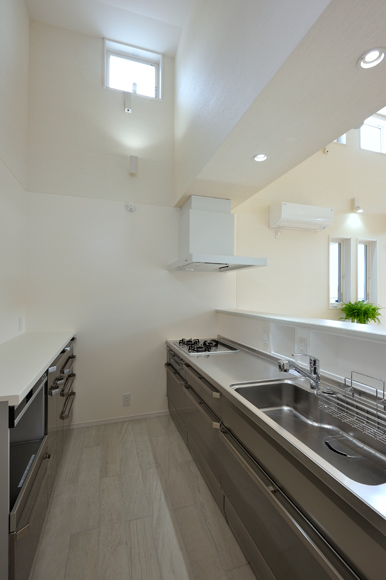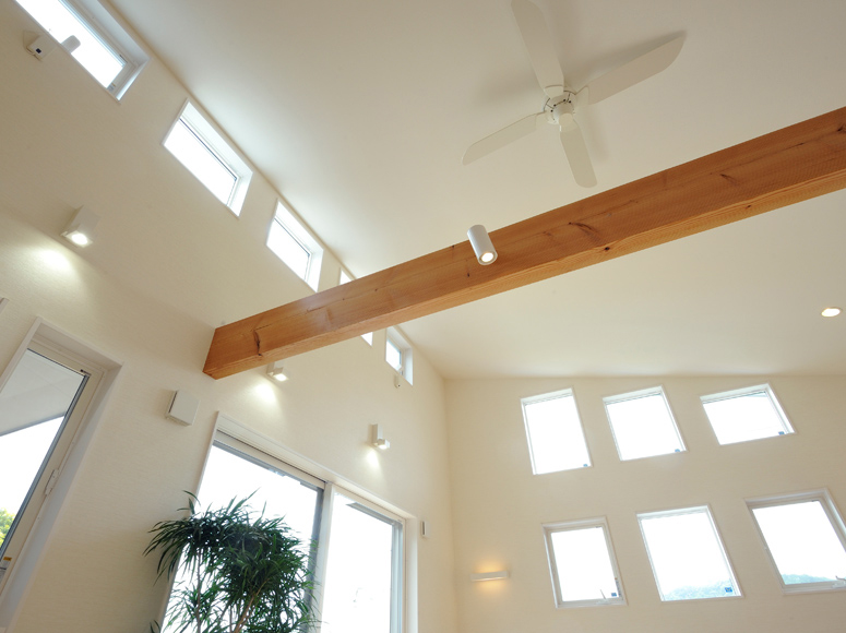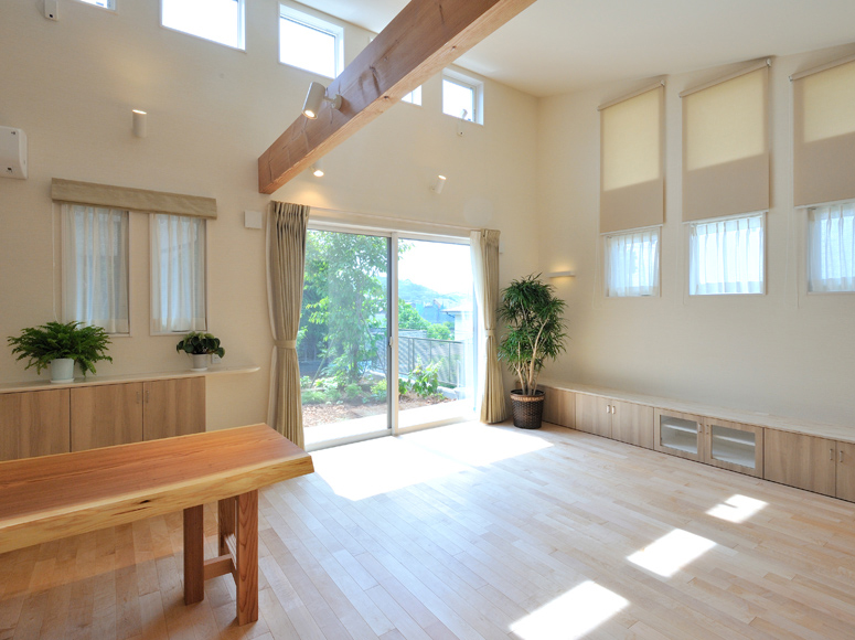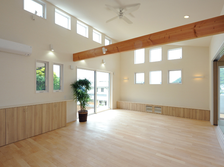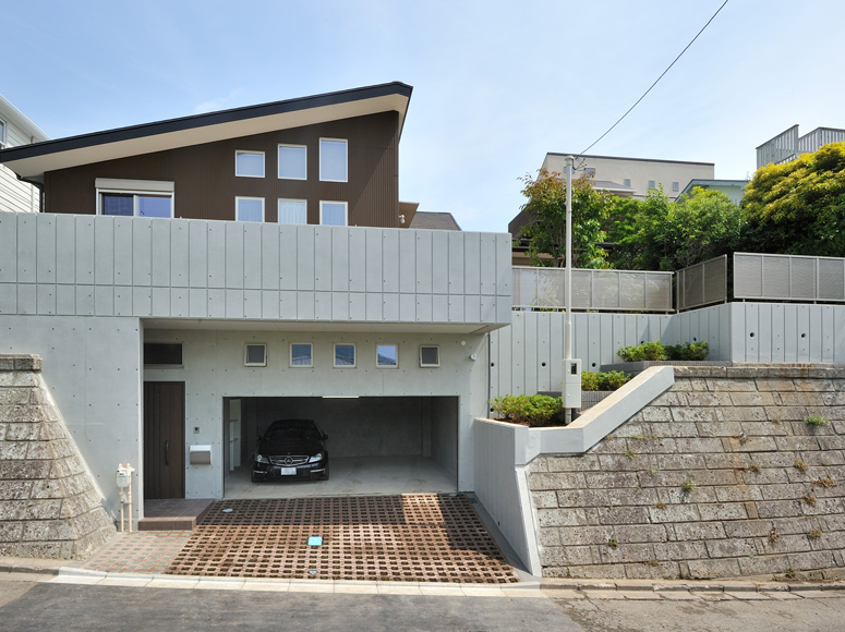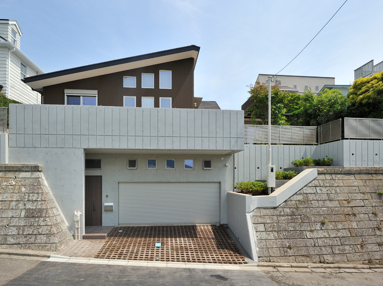 道路と1階のグランドレベルに、約4メートルもの高低差がある『地下室・地下車庫のある家』です。『相模湾越しに富士山の見える眺望を楽しみたい!』と、当初は二階建てのプランをお望みでした。しかし、建築制限の厳しいこの地域で、二階建てのプランでは魅力的な建物ができないと判断し、土地の広さを活かした平屋建てをご提案しました。齢を重ねると、上下階を往復する生活動線よりも、1フロアで完結する暮らしの方が断然便利です。天井の高い開放的な空間もつくれますし、家族の気配も感じられるので安心です。