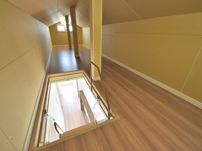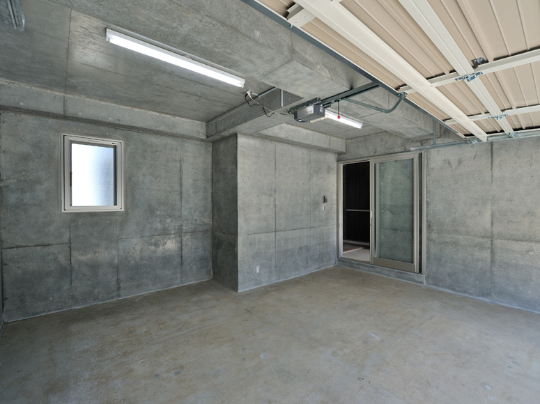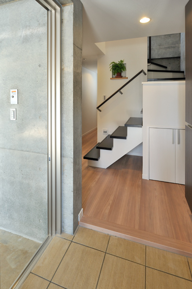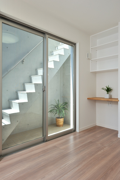 ご覧の通り、道路とフラットな高さに玄関を配置し、ストレスなく室内に入れます。容積率の緩和措置を受けられるので、地下の納戸、トイレ、地下室は容積に算入されません。地下室といっても、ドライエリアから光が差し込むので、居住空間として利用可能です。おかげで、書斎も納戸も吹き抜けも実現しながら必要な部屋数を確保した二世帯住宅ができあがりました。