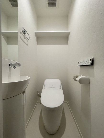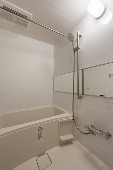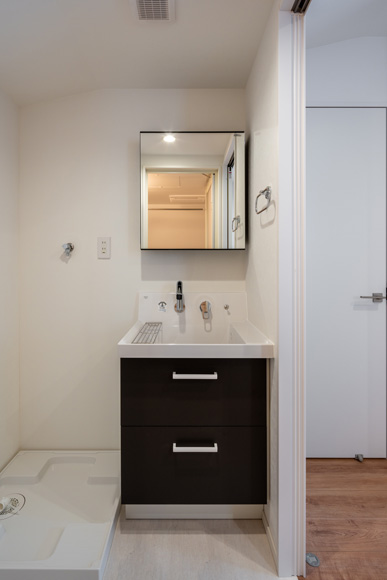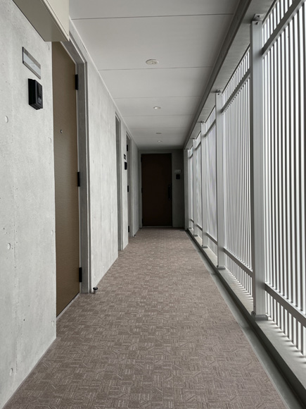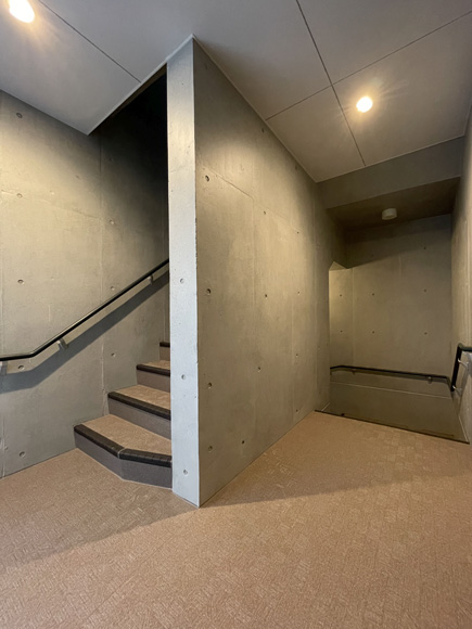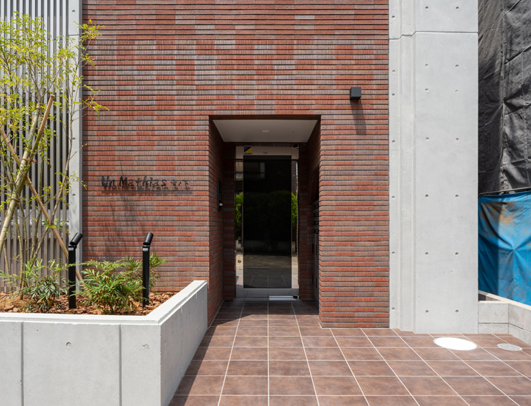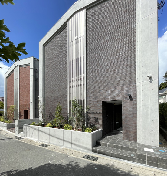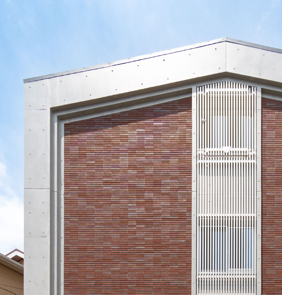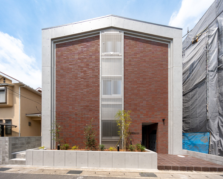 コンクリート打ちっぱなしの太い輪郭の内側に3層の段差をつけて引きをつくり、内部には一枚一枚表情の違うタイルをあしらいました。縦のセンターに設けたルーバーがアクセントになっています。